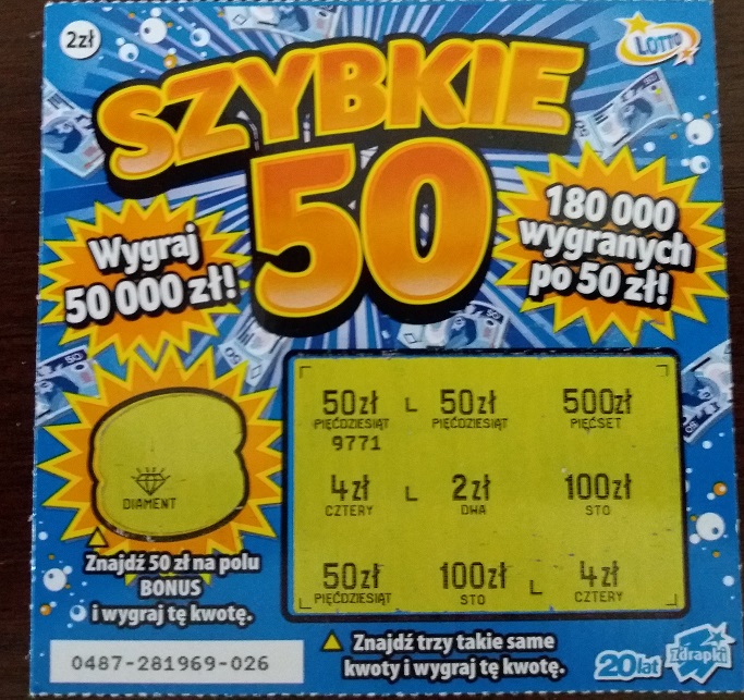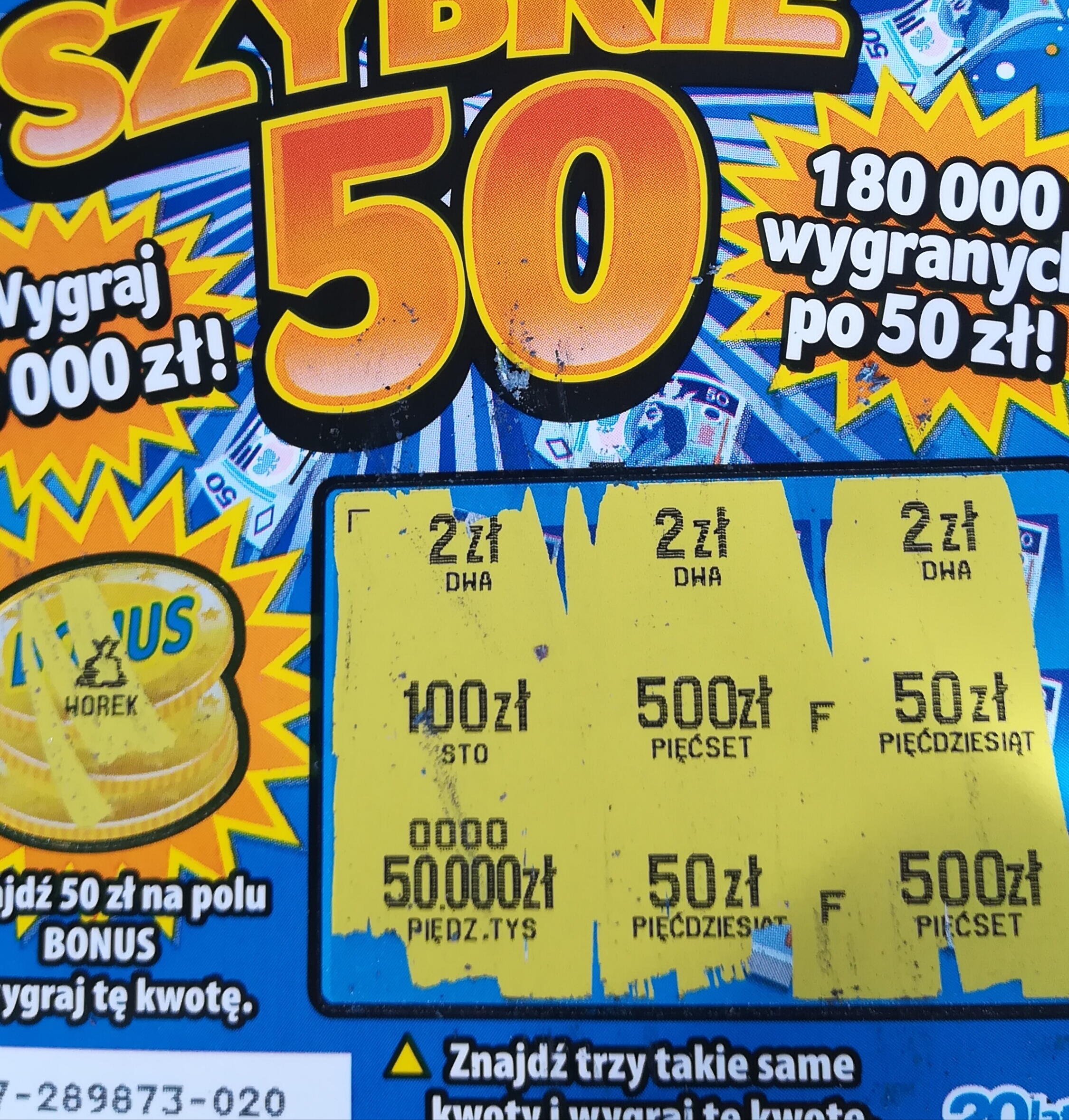 Po wielu tygodniach prób w końcu wydrapałem 50 zeta. Wpadło w numerku 015 w bonusie, kupiłem 1 sztukę. Skoro nadeszło przełamanie, to może wydrapanie kolejnej pięćdziesiątki zajmie trochę mniej czasu
