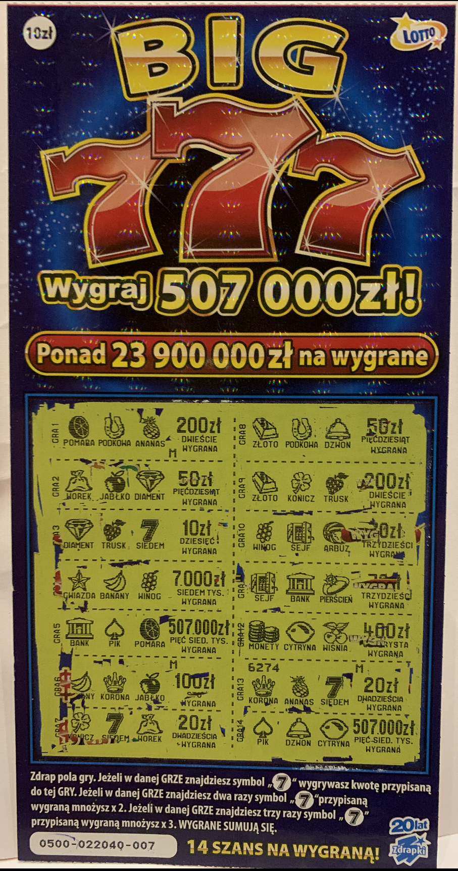 U mnie pustak i zwrot. Nie lubię zdrapek, gdzie kontrolne są porozrzucane po zdrapce i trzeba całą zadrapać, żeby je znaleźć. Jeszcze warstwa ścieralna z tych trudniejszych.