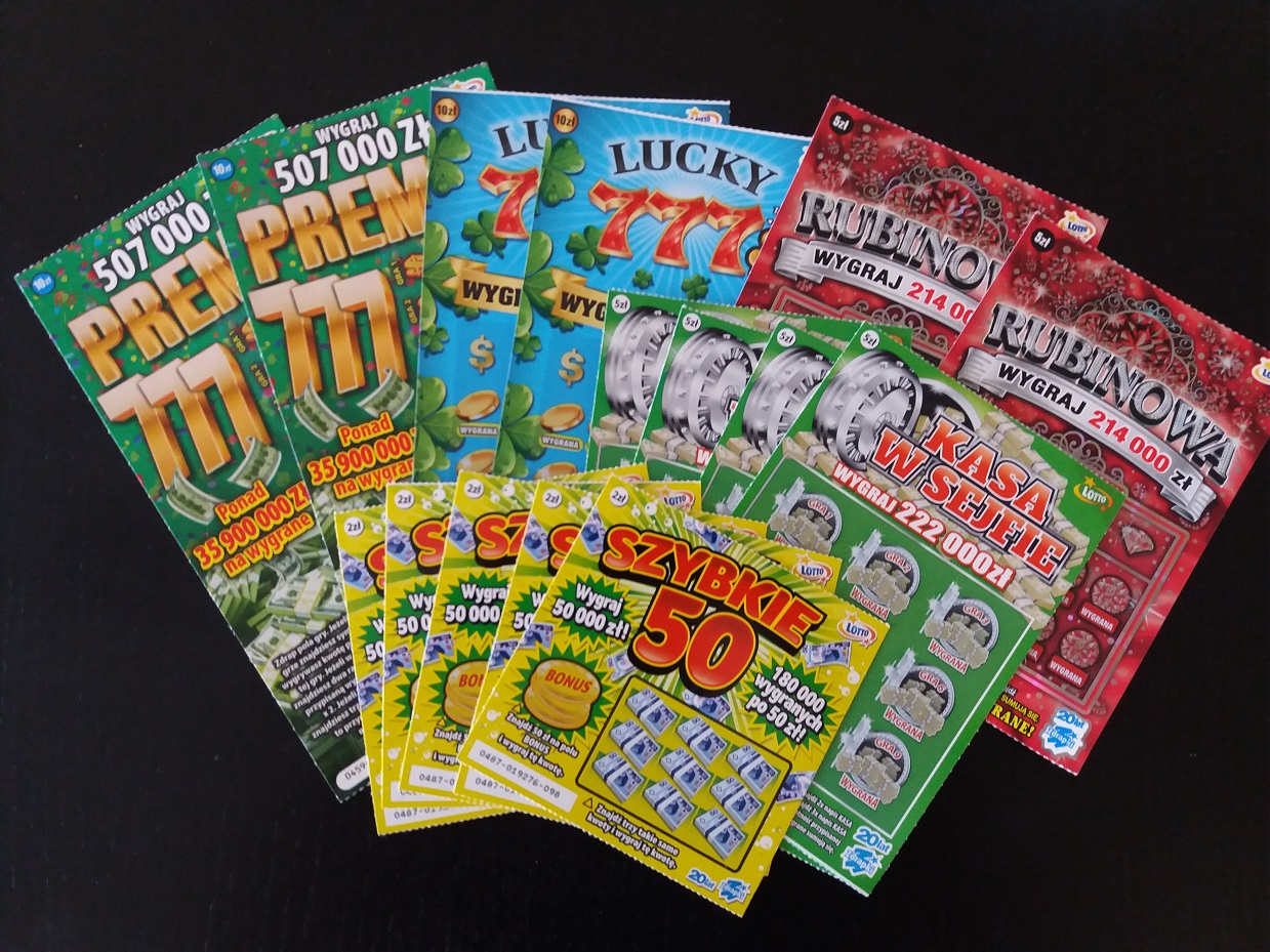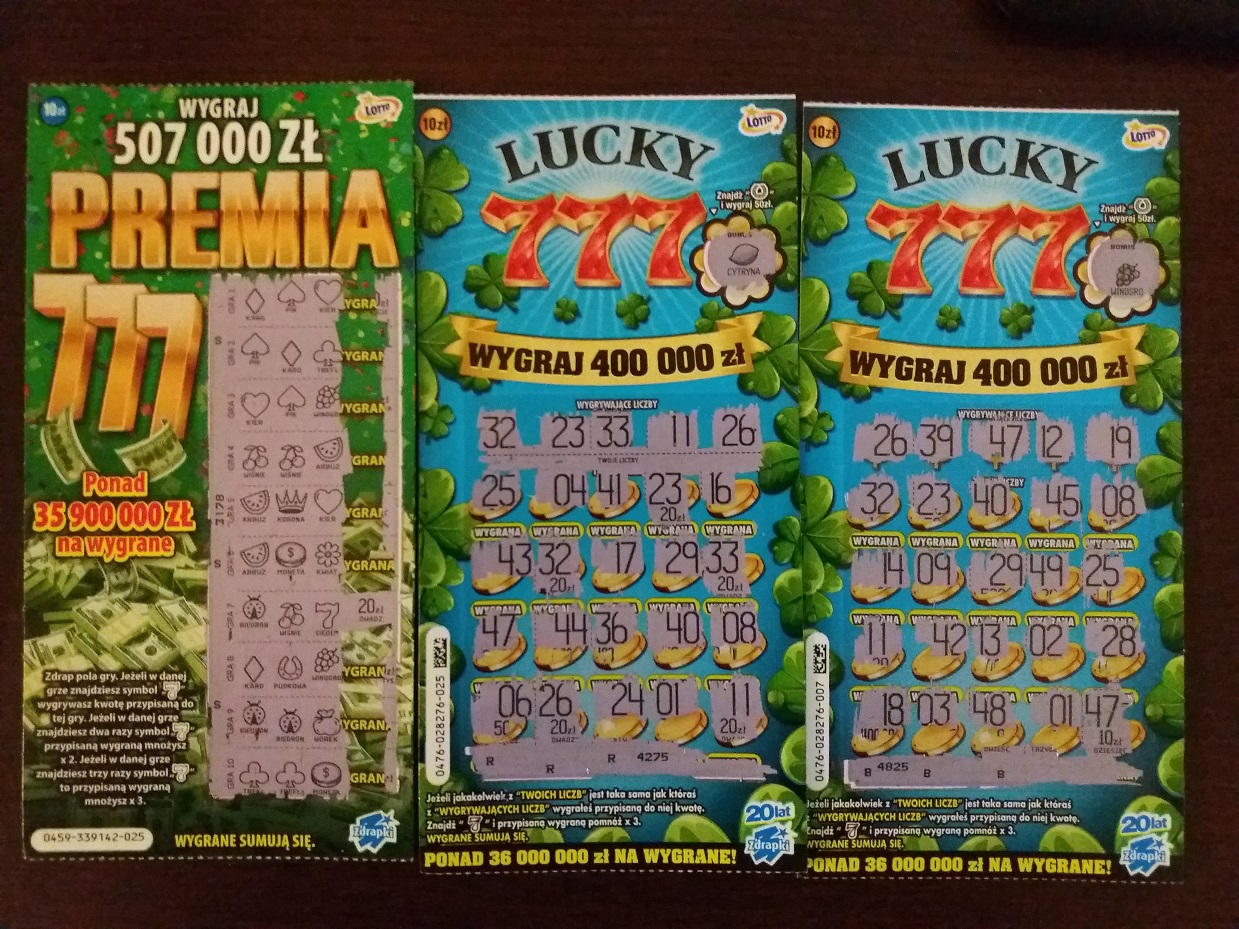 Dzisiaj odwiedziłem kilkanaście kolektur, głównie punktów własnych TS i niestety nigdzie nie znalazłem gorących przedziałów Big 777, Premii 777 oraz nigdzie nie było czarnej Góry kasy. Nie mam zamiaru kupować zdrapek z przedziałami, w których nie ma możliwość trafienia głównej, bo to bez sensu. Kupiłem jednak 2 szt. Premii 777, bo jeszcze nigdy jej nie drapałem, a może wpadnie coś fajnego
