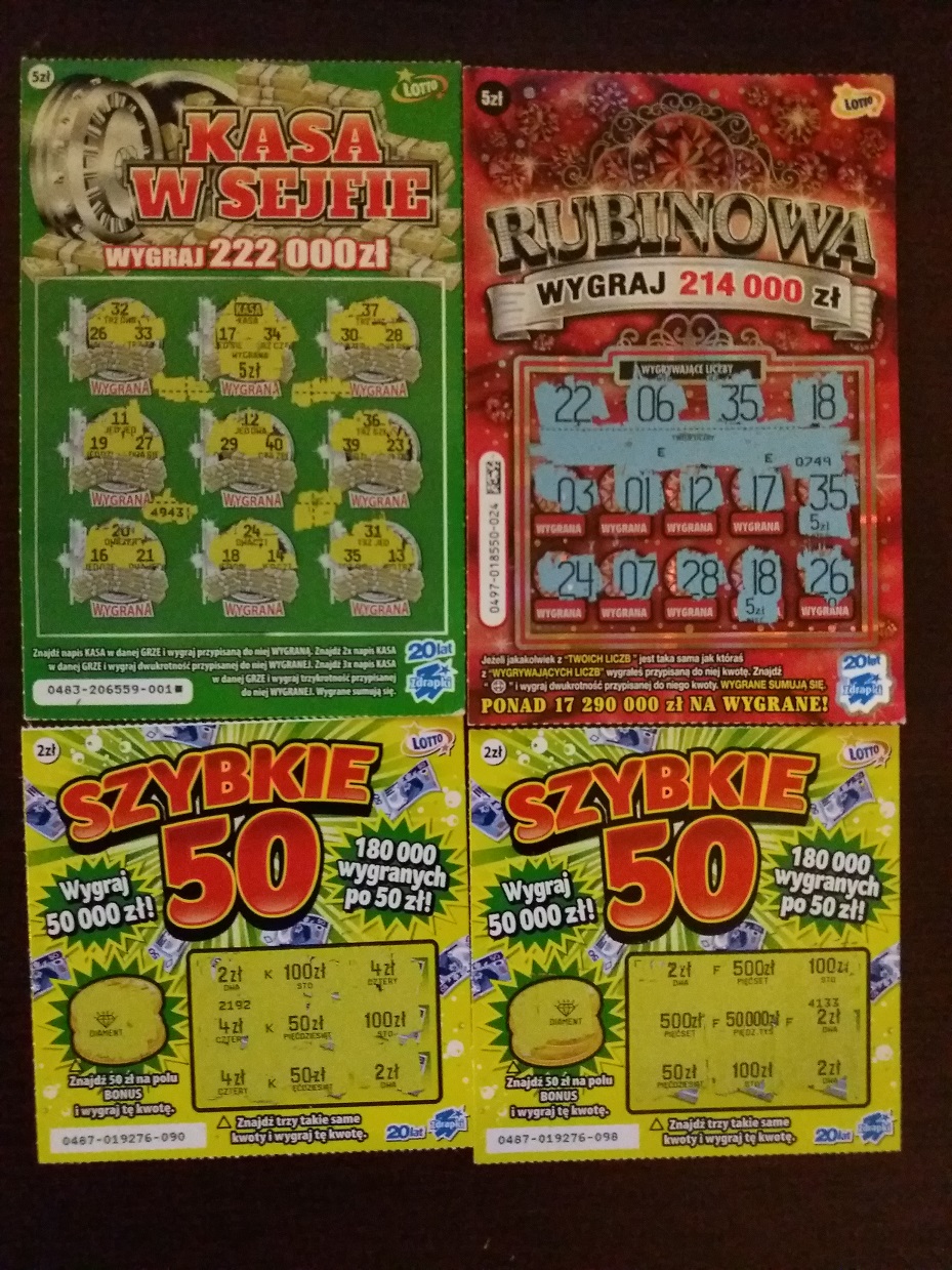 U mnie dzisiaj lipa. NA 90zł zwrot 28zł -.- Drapię dopiero od może tygodnia i stąd ten zapał do odwiedzania kolektur. Jednak musze ograniczyć budżet na to do 300zł tygodniowo bo w tym tempie kupowania zdrapek po pierwsze wpadnę w nałóg, a po drugie wyczyszczę się z kasy ;p Początki nowicjusza i w pierwszym tygodniu wydrapałem łącznie jakieś 350zł przy 150zł wkładu.
