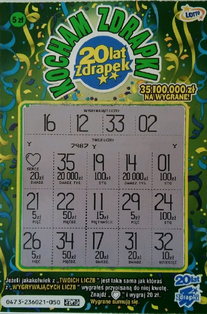Na trzy kupione, jedna pusta, 10 zł w 001 oraz 20 zł w zdrapce z numerem 050