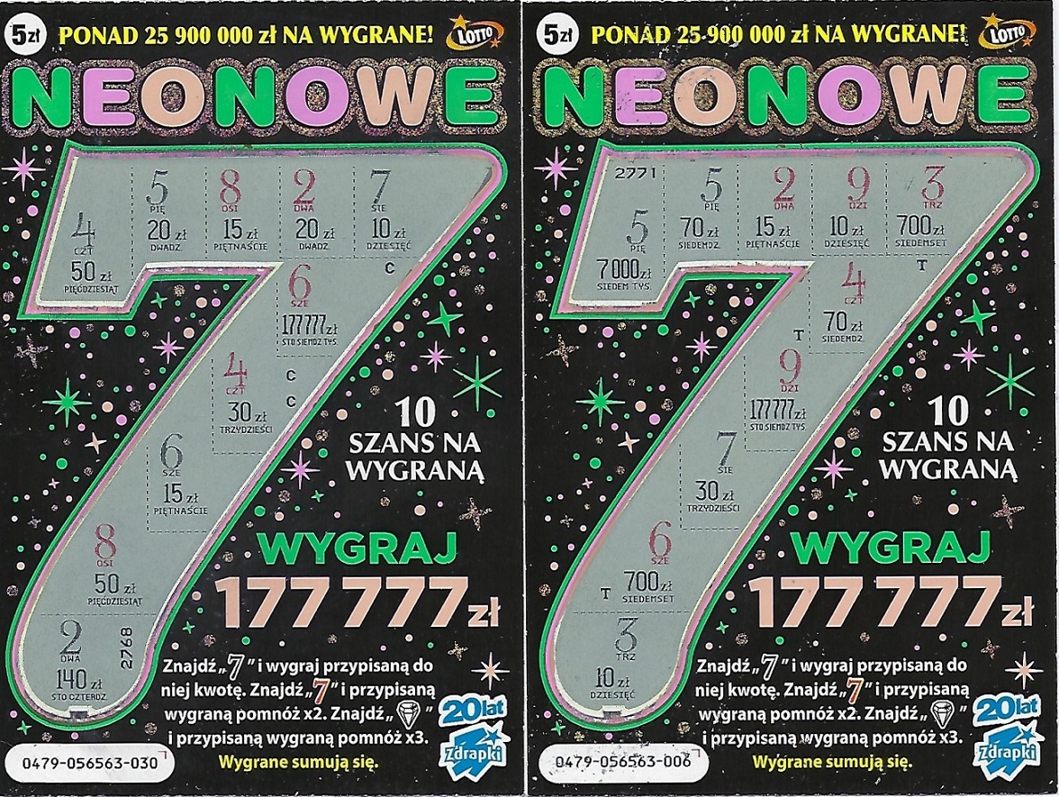 Dawno nie kupowałam zdrapek po 5 zł. A że mieli w punktach, które odwiedzam nowe paczki to wzięłam trzy Neonowe. W dwóch zwrot, jedna pusta.Zwroty wymieniłam, co się opłaciło.Miałam jedną pustą,numer 045, w 020 było 10 zł a w 049 po raz drugi trafiłam 50 zł