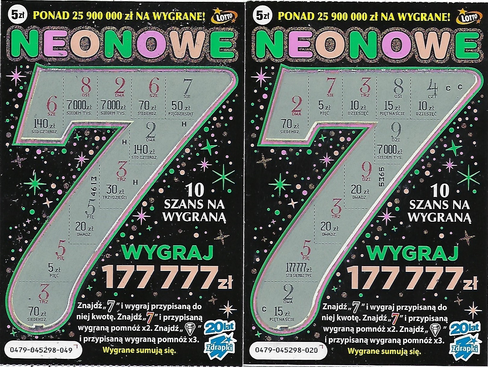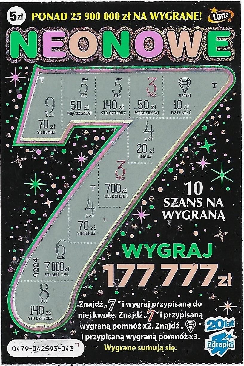 Dawno nie kupowałam zdrapek po 5 zł. A że mieli w punktach, które odwiedzam nowe paczki to wzięłam trzy Neonowe. W dwóch zwrot, jedna pusta.Zwroty wymieniłam, co się opłaciło.Miałam jedną pustą,numer 045, w 020 było 10 zł a w 049 po raz drugi trafiłam 50 zł