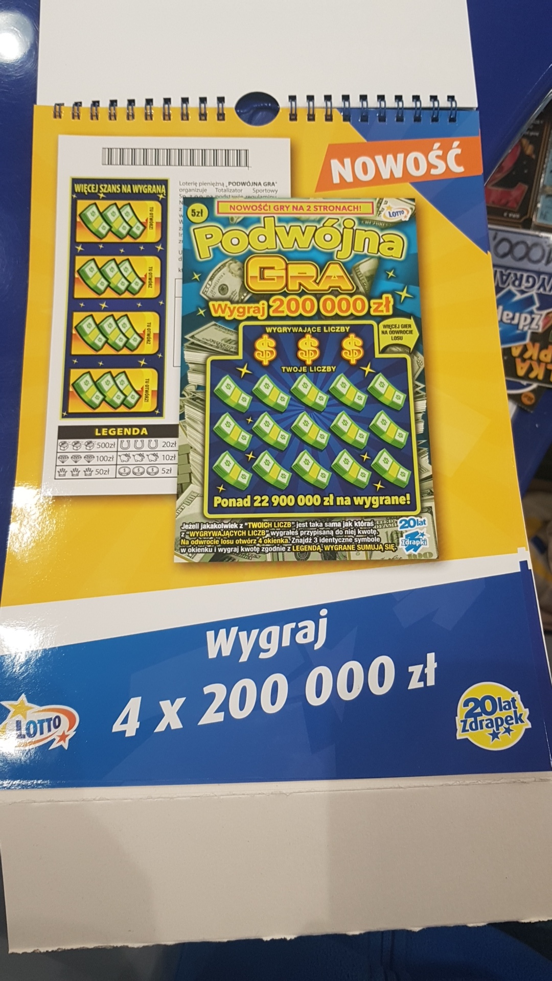 Dzisiaj pojawił się w mojej kolekturze kalendarz z nowościami. Postaram się jutro zrobić zdjęcia. Z ciekawszych rzeczy to to,że zdrapka,bodajże Podwójna gra będzie miała dodatkowo z tyłu zdrapki 4 okienka do otwarcia i jak się trafi 3 takie same symbole to się wygrywa. Z przodu natomiast będą liczby wygrywające tak jak np.w Ekstra pensji. Extra linie za 10 zł będą takie jak super linie,będzie tylko więcej rzędów. Białe złoto to taka biało-srebrna zdrapka,też znajdź liczby jak klasyka w zdrapkach za 5 zł,tylko na górze będzie jeszcze mnożnik x2,x3 i x5.Szalone zakupy za 5 zł-znajdź wygrywające liczby i dwa bonusy,coś jak Moje 77.Kieszonkowe za 1 zł-znajdź symbol banknotu i wygraj przypisaną kwotę.Piszę z pamięci,jakby co to jutro zweryfikuję te informacje