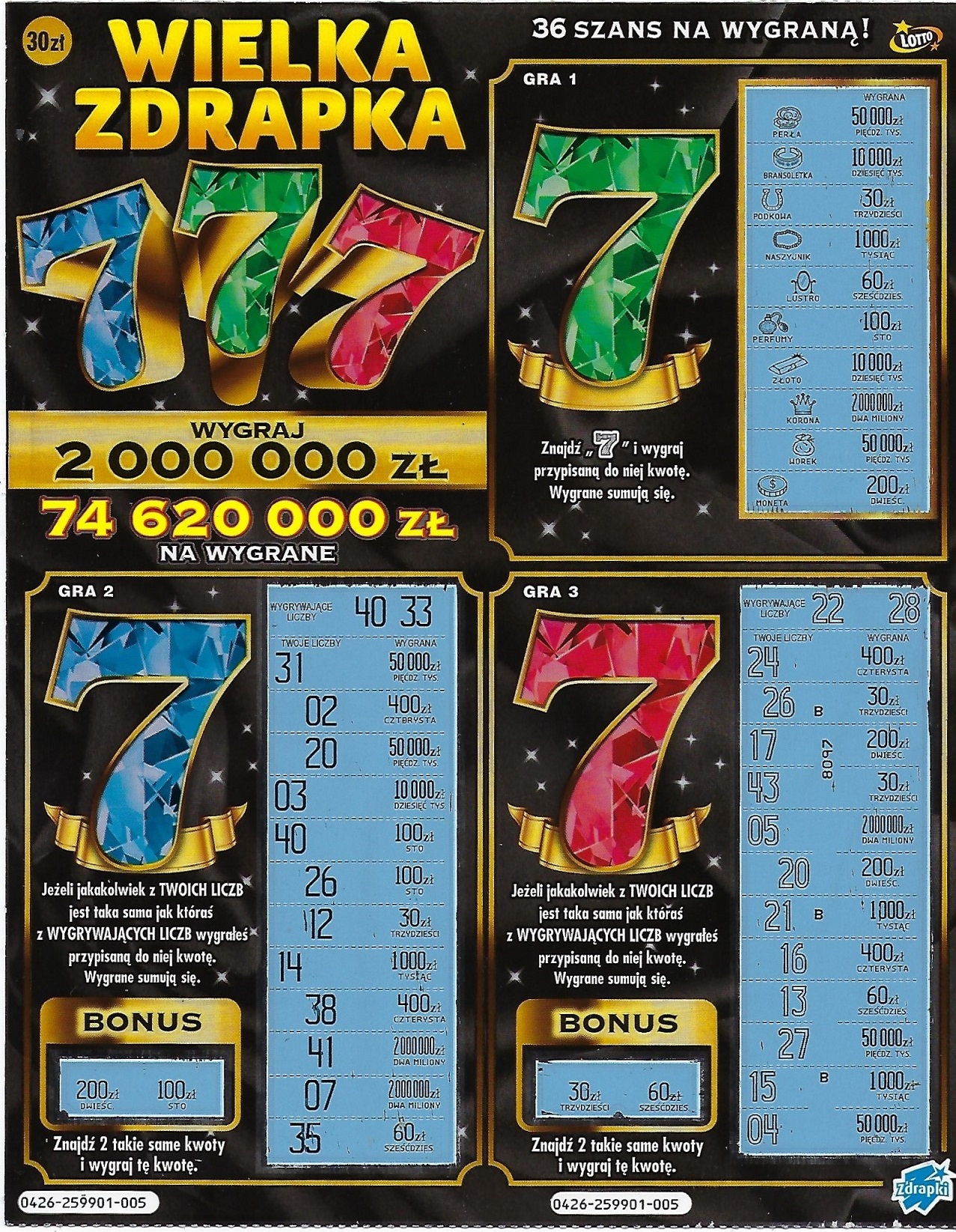 Dziś, wymieniając wygrane zdrapki wzięłam jedną sztukę Wielkiej z numerem 005, w którym było 100 zł