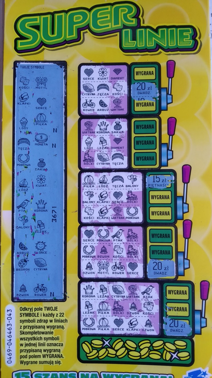 Nie zdążyłem wcześniej napisać. Super Linie bardzo mi się podobały bo poza przyjemnością z gry rozwijały także spostrzegawczość. To była moja pierwsza zdrapka w życiu, więc muszę powiedzieć, że mi się to nowe hobby będzie podobało. Zdrapaliśmy kupony z córką, ale muszę uważać, bo dzieci łatwo się wkręcają w hazard i widziałem, że może trochę za bardzo "dzieli skórę na niedźwiedziu", jakbyśmy już wygrali.