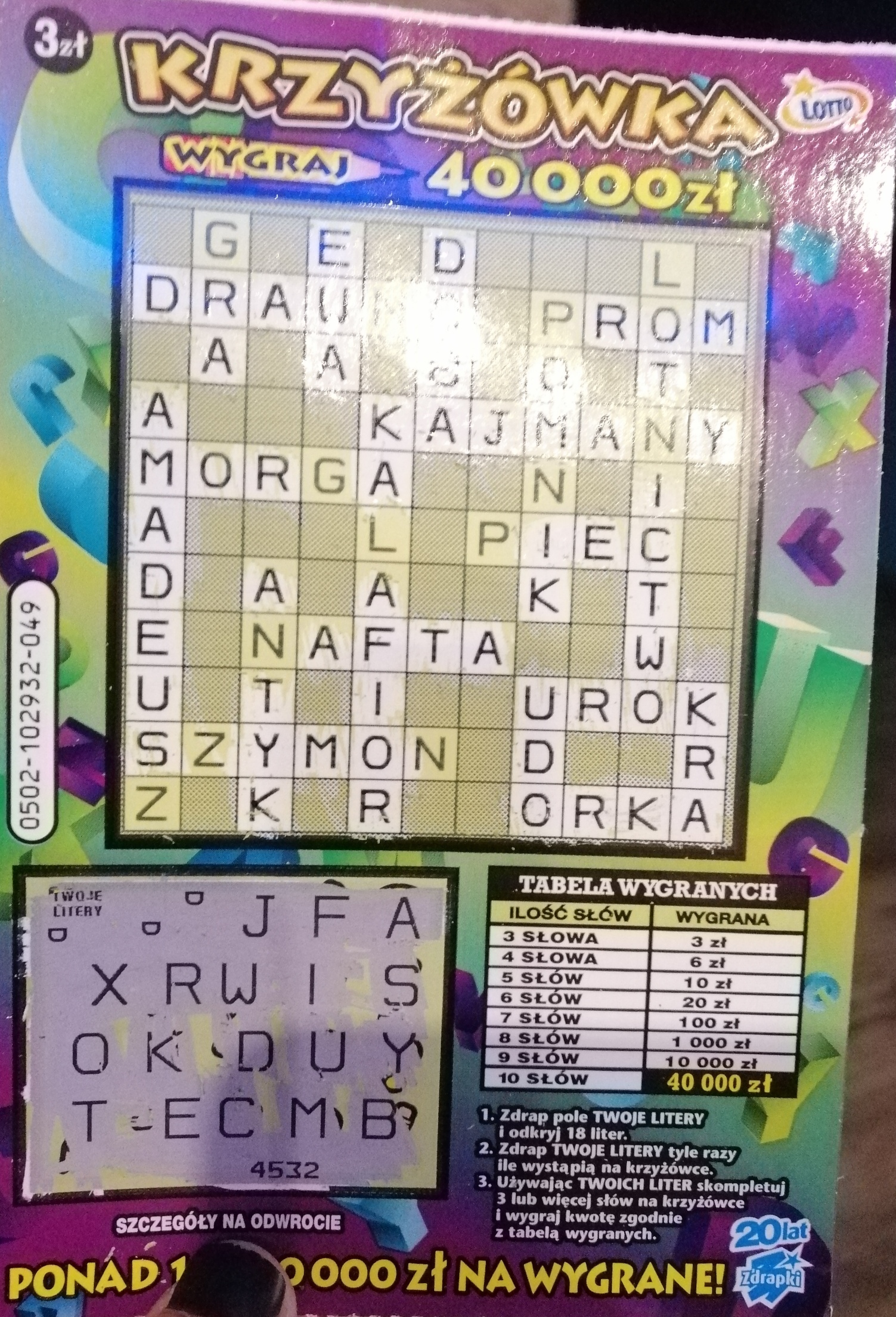 Wczoraj wygrałam 100 zł . Była otwarta cała nowa paczka. Kupiłam tylko jedną sztukę. Ostatnie 100 zł w krzyżówce trafiłam w zeszłym roku kilka miesięcy temu. Także druga stówka już.