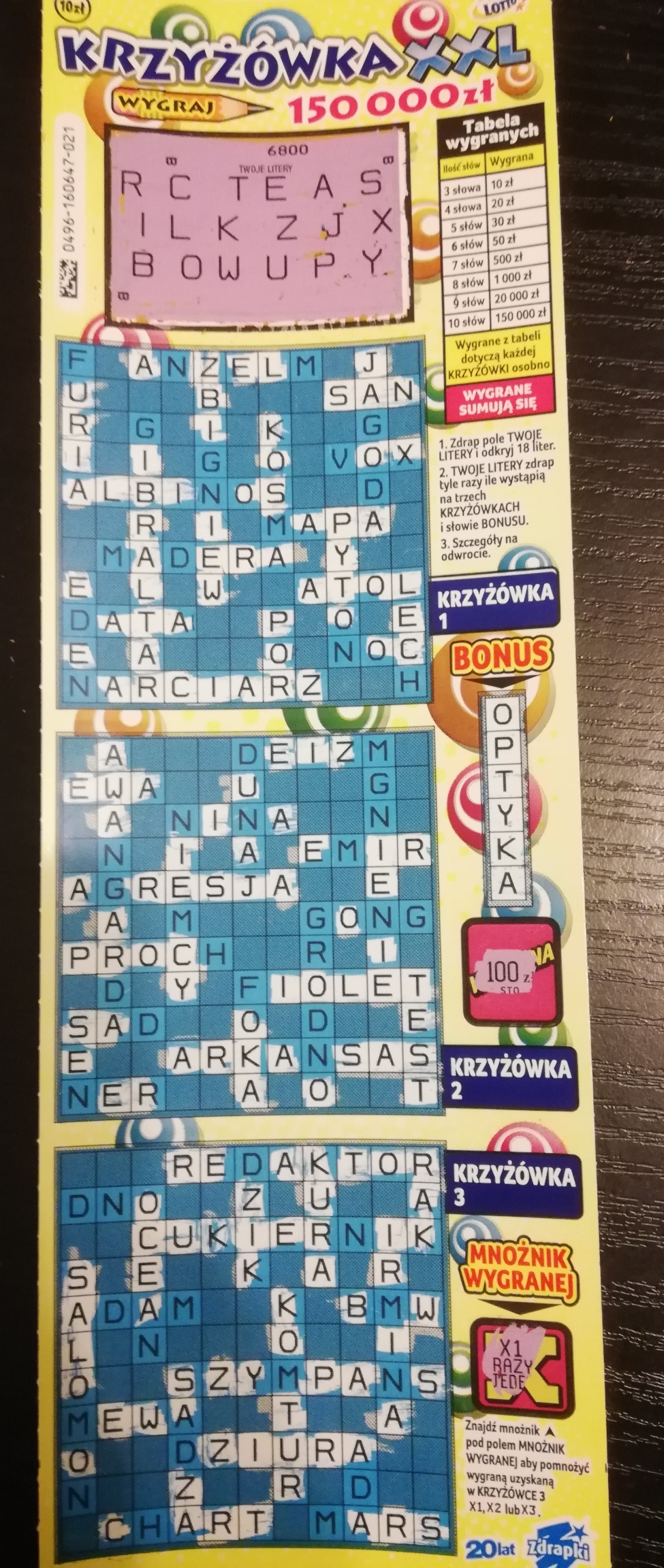 Z nowej paczki w nr017 w drugiej krzyżówce wpadło 20 zł