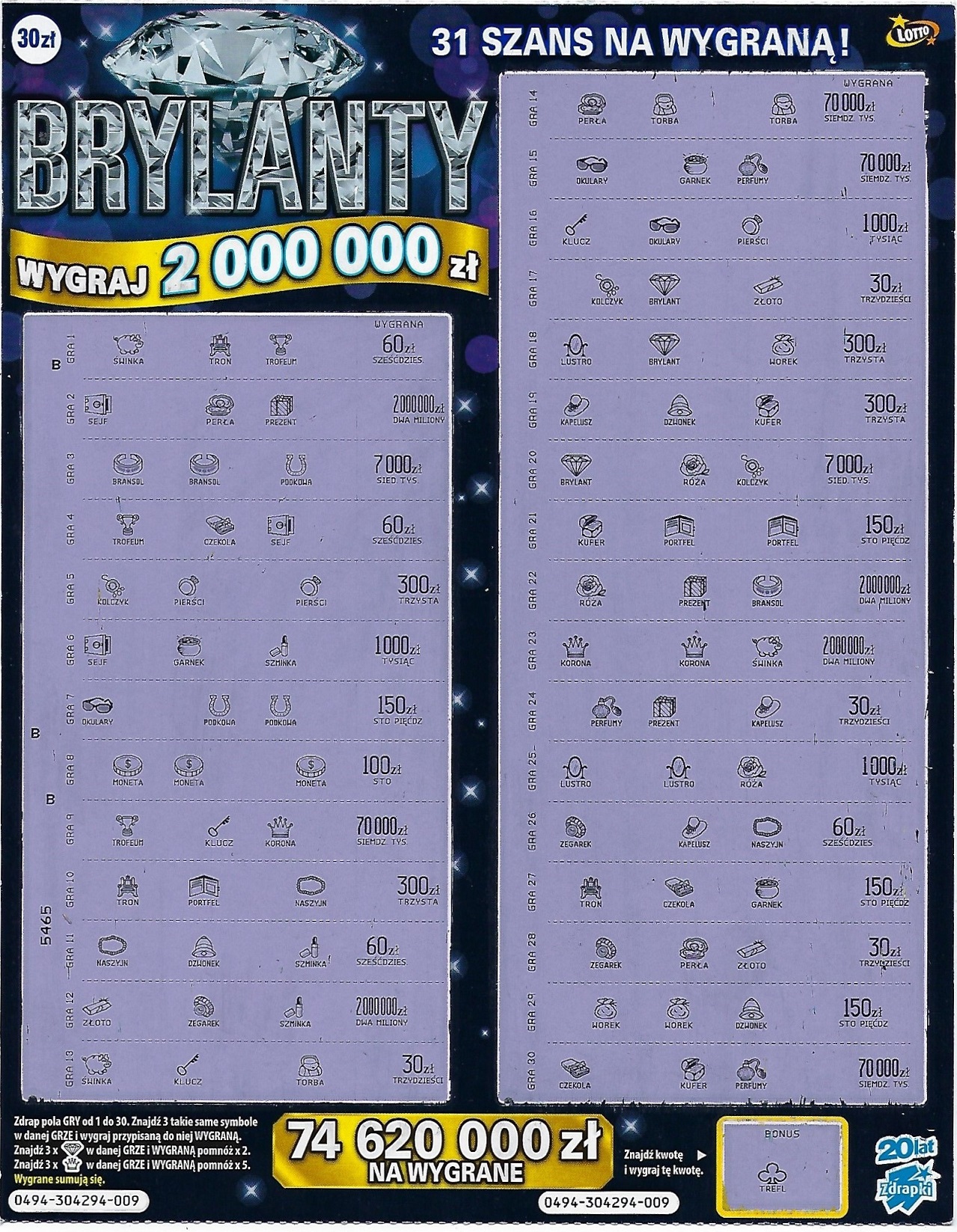 Ja w brylantach szczęścia nie mam przeważnie pusto dzisiaj zwrot potem pustak ,ale dzień na plus w krzyżówce za 30 zł stówa i w premi za 5 trzy stówy