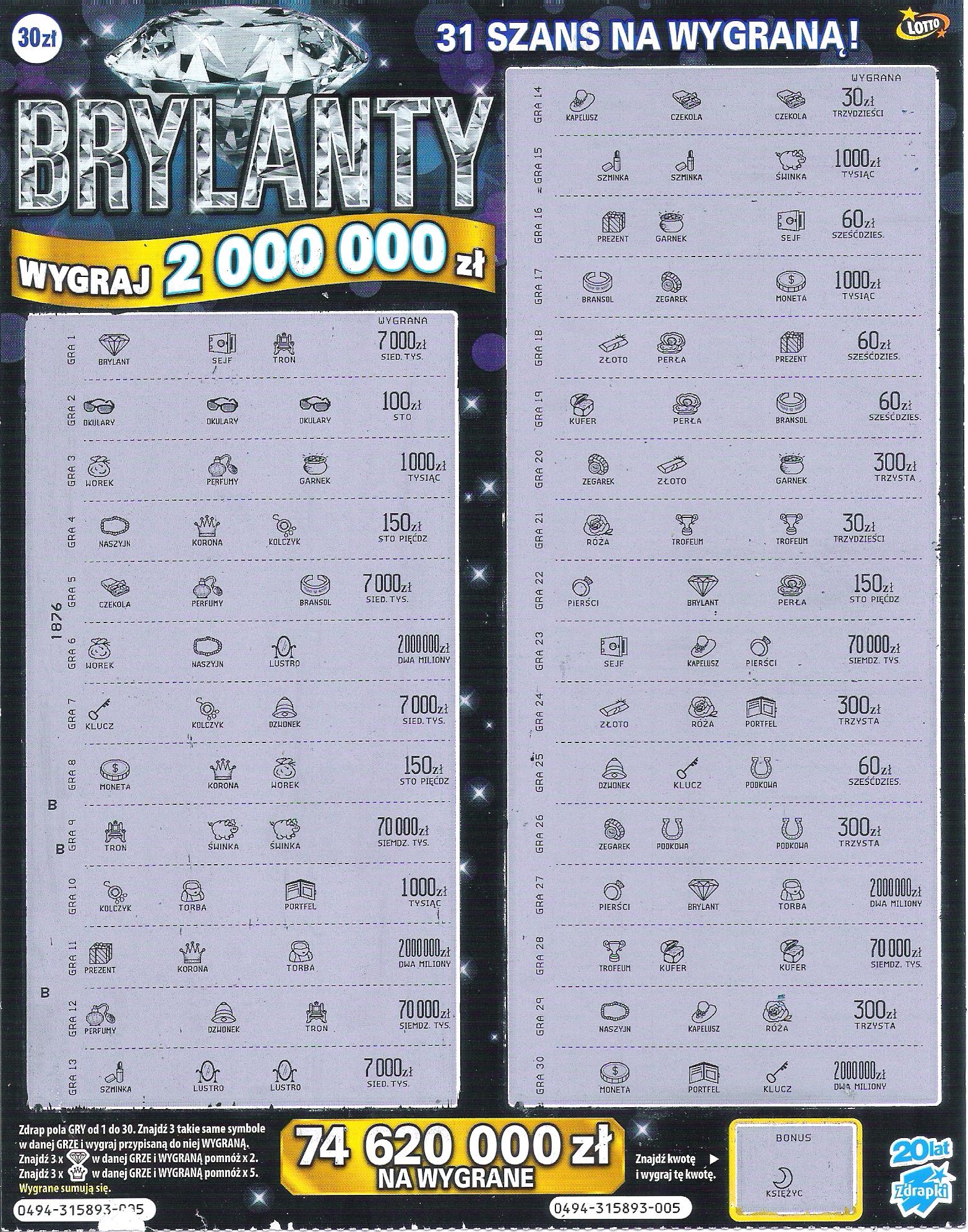 Wczoraj rano wymieniając zdrapki wzięłam dwie sztuki Brylantów. W zdrapce nr 001 było 30 zł natomiast w nr 005 trafione 100 zł