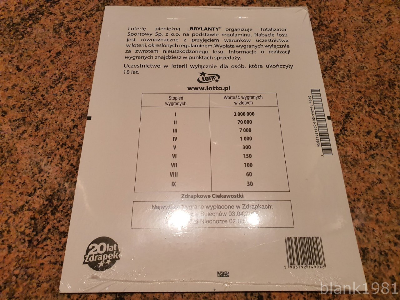 Dziś rano przy wymianie zdrapek wzięłam dwie sztuki Brylantów z całej, nowej paczki. Nr 001 okazał się pusty, w nr 010 było 60 zł.