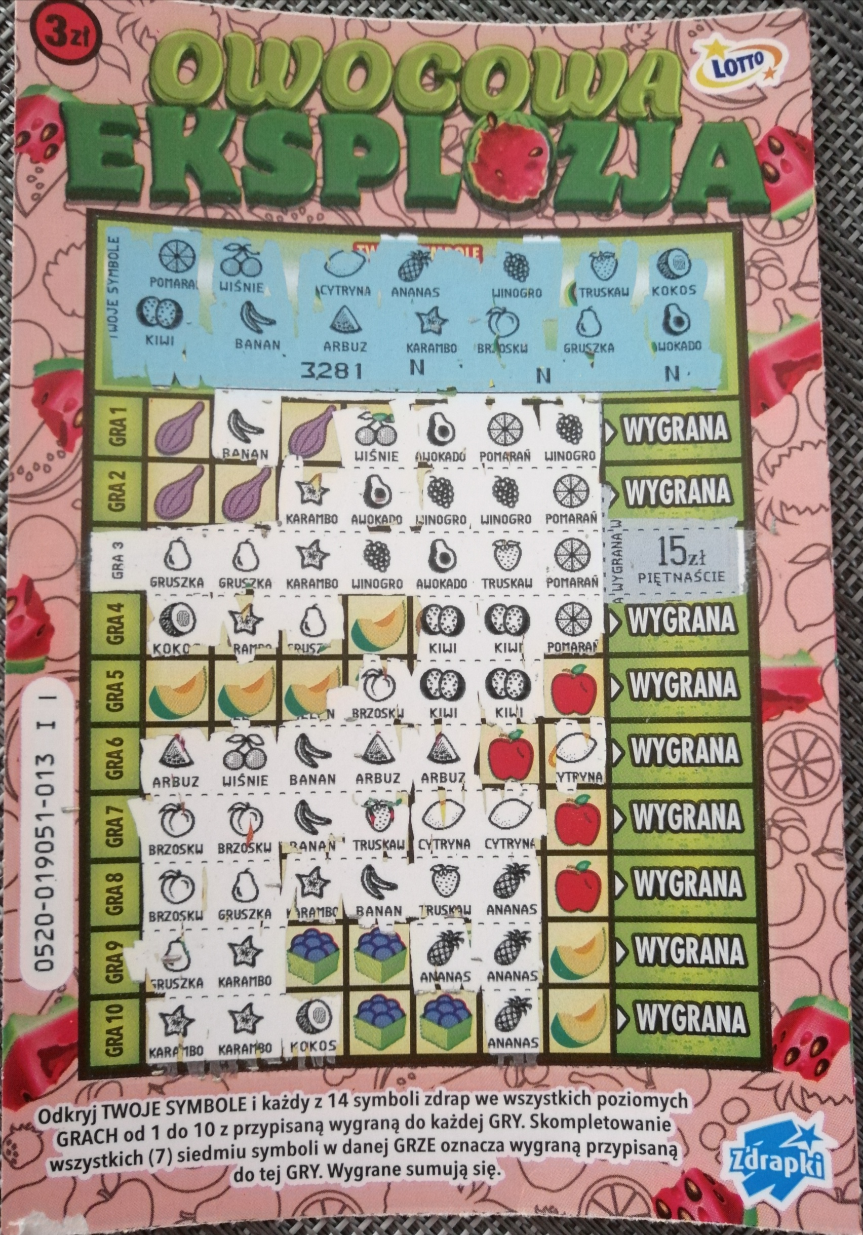 Kupione 5 sztuk w różnych punktach jako ulubiona zdrapka odwdzięczyła się i znowu pewnie aleja . Jeden zwrot 2 puste perła 300 zł , ostatnia właśnie się zdrapuje