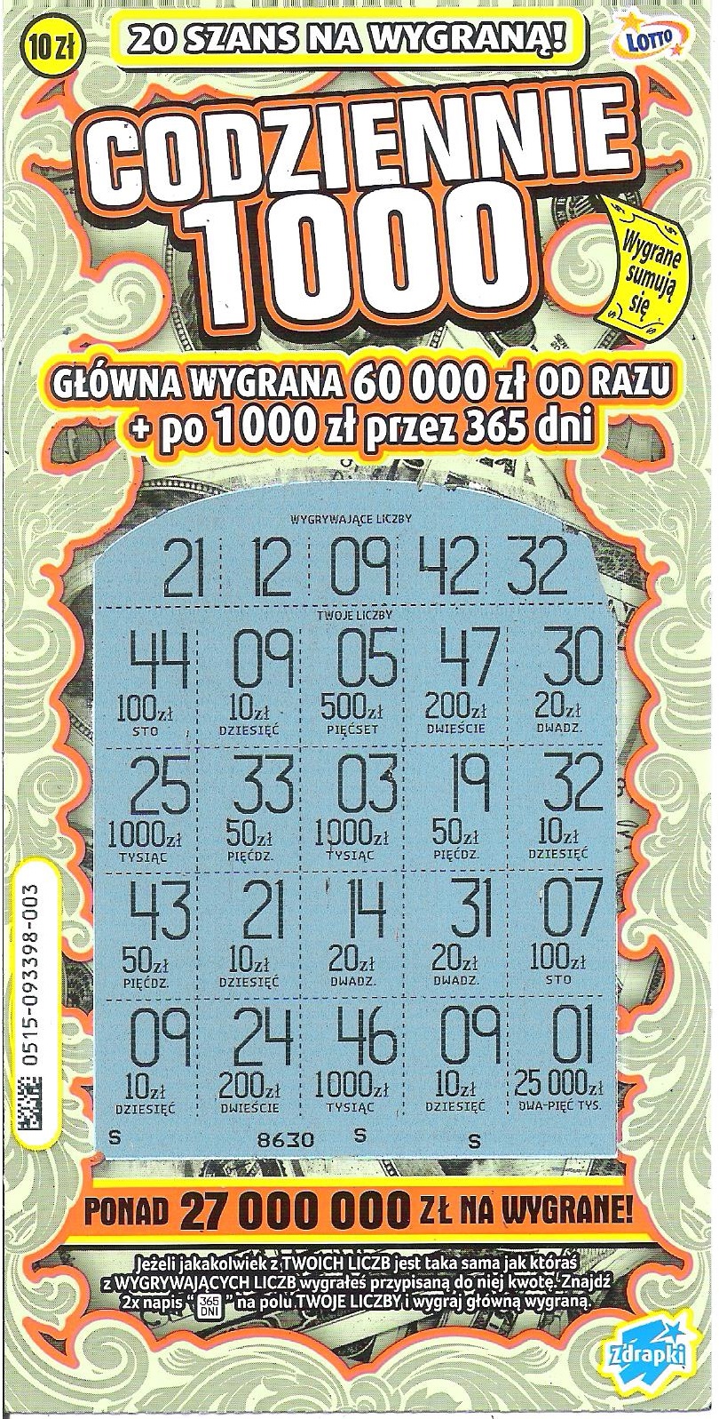 Wzięłam jedną sztukę z przebranej już paczki.Z pięciu zdrapek wybrałam nr 003 i trafiłam 50 zł