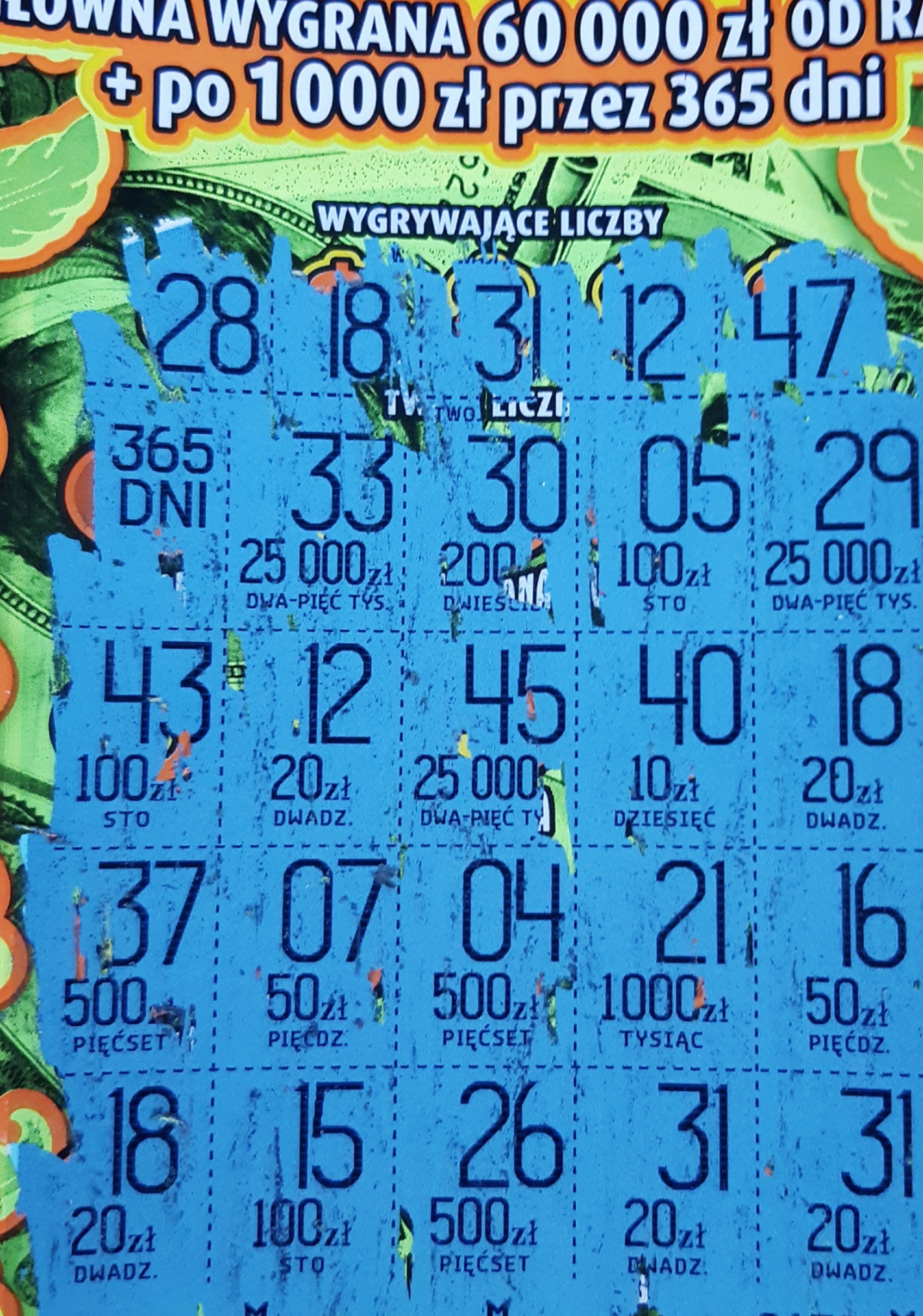 Wzięłam jedną sztukę z przebranej już paczki.Z pięciu zdrapek wybrałam nr 003 i trafiłam 50 zł