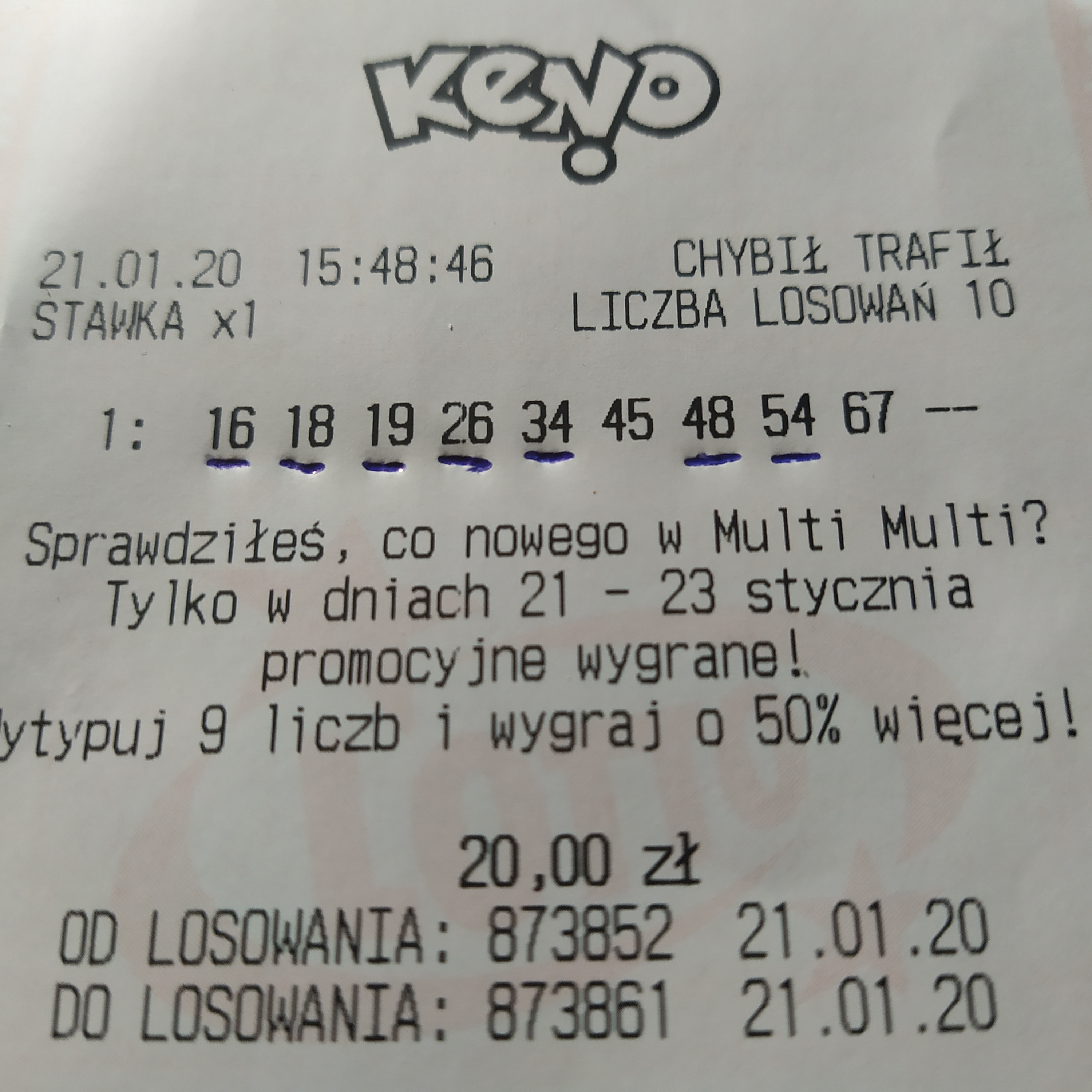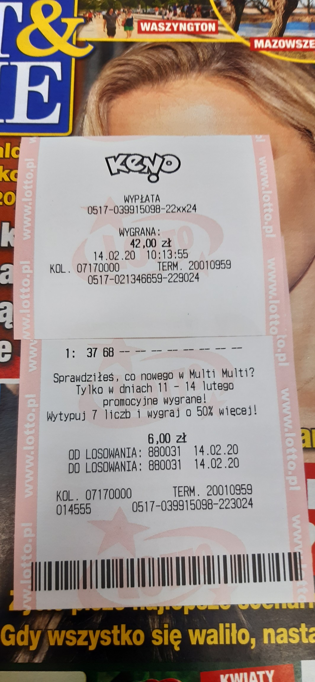 7/9 w Keno wygrana 100 zł.Kupon z zeszłego tygodnia.