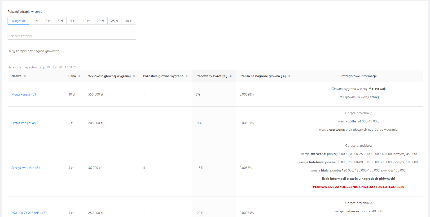 - Sortowanie danych po wielu parametrach: nazwa zdrapki, cena, szansa na główną wygraną, itp.