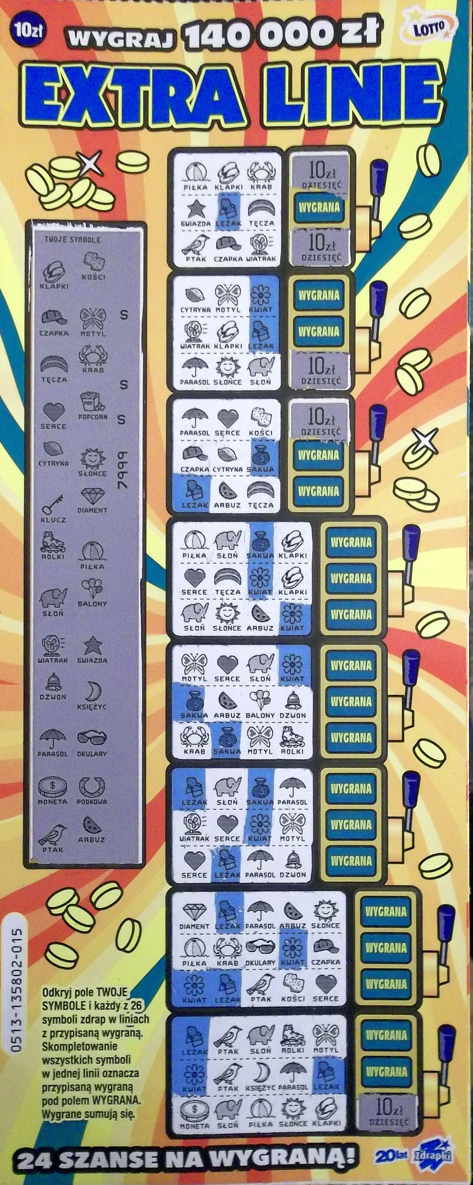 Dziś do zakupów Extra Linie wziełam z braku czegokolwiek. Nr 21 (jak u ER przed chwilą) i jest 20 zł. Zostały jeszcze nr 12 i 18 oraz 22,23,24,25. Nie wiem czy iść po następną. A jeśli tak, to który numer brać żeby wygrać?