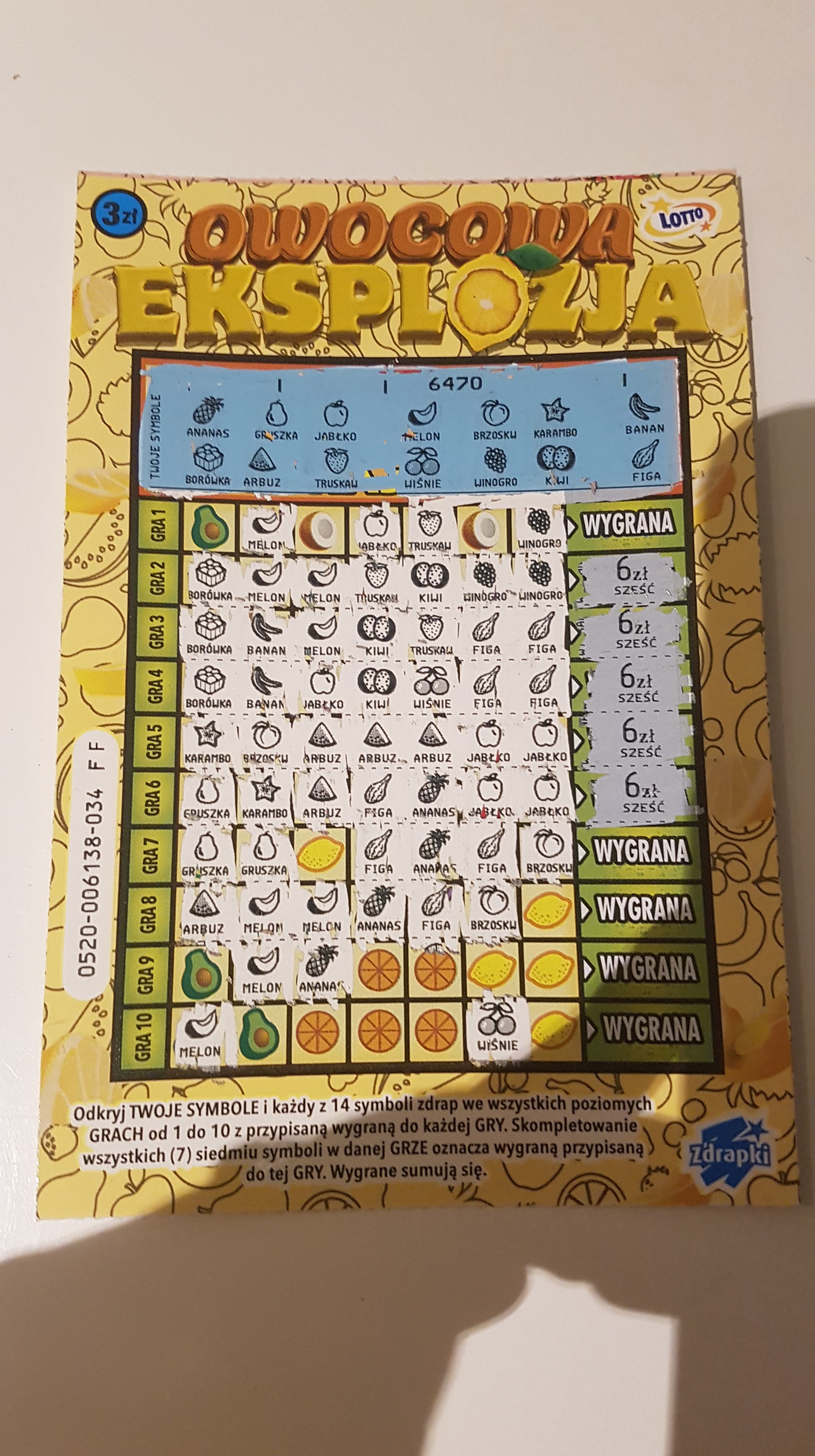 gratki kawka28 i wydrap głównąkawka28 pisze: ↑17 mar 2020, 23:43Dla mnie ta edycja owocowej szczęśliwie się zaczęła (w przeciwieństwie do fali pustaków w extra i super liniach), kupione może z 12 szt narazie, w tym 2 razy po 15 zł, wczoraj 30 zł, więc gram dalej z nadzieją że i w tej edycji główną do Krosna podeślą, tamtej było szkoda bo w mojej szczęśliwej kolekturzepotem czekam na szczęśliwe linie, zdrapki za 3 zł moja ulubiona grupa, ale może i na boom777 się skuszę czasem bo w big777 dobrze mi szło, ale jakoś szybko główne poszły i już później nie kupowałam