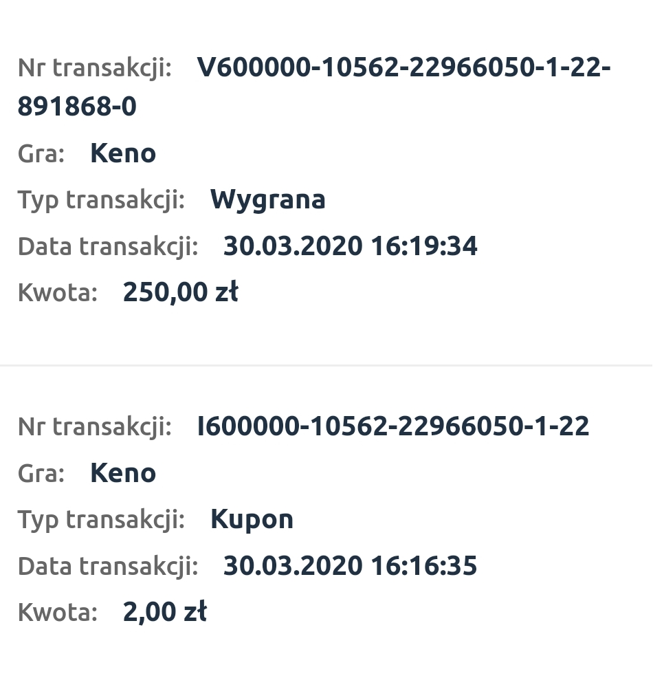 Kate77 pisze: ↑08 mar 2020, 18:38Własne typy, dwa losowania. Później wysłałam jeszcze ok 20 - 30 zakładów myśląc, że dziś jest fart i już było 0 zl:(same zera, serio raz 2 i raz 4 zl