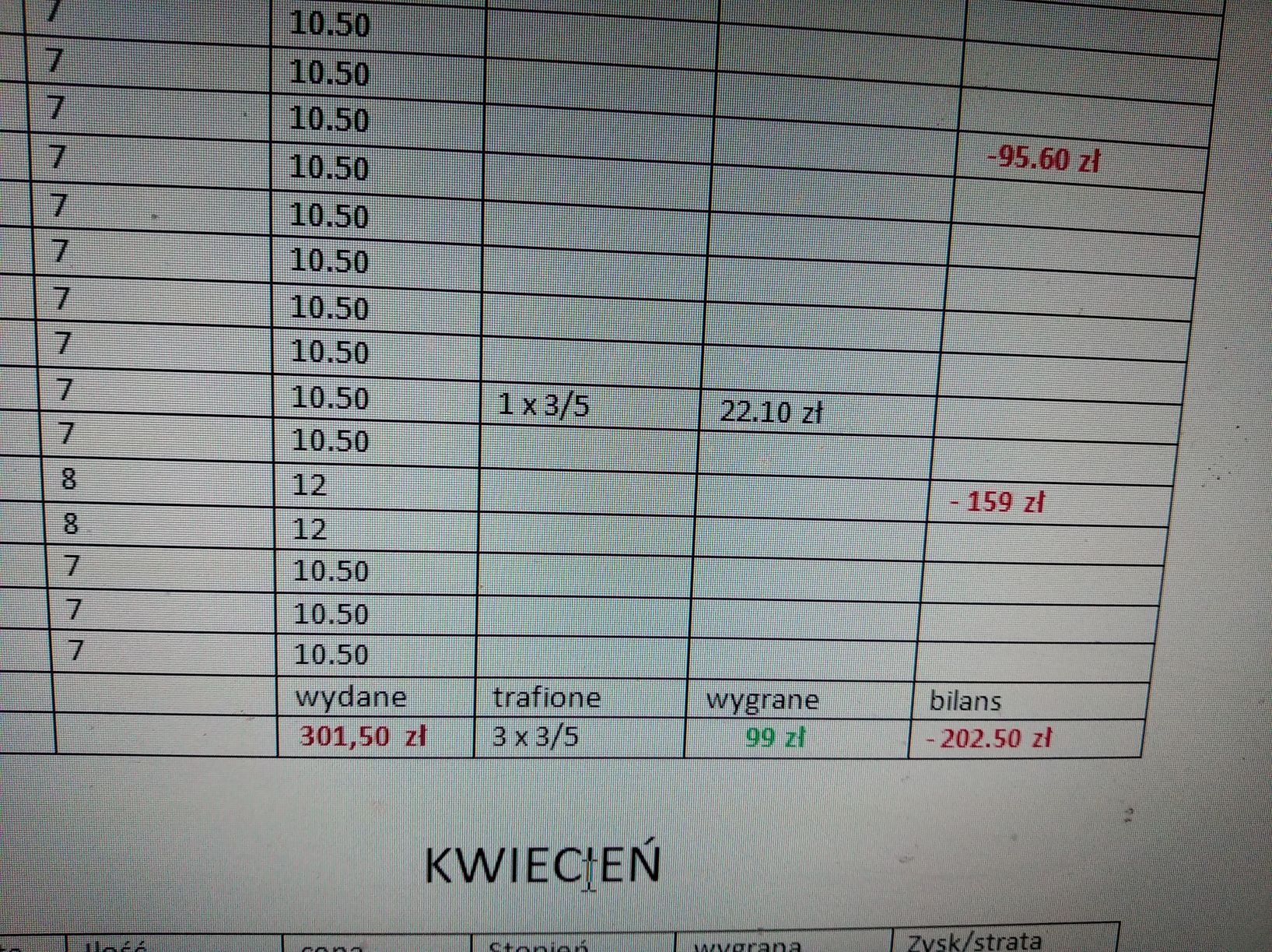 Trafiłem 3 x 3/5 , bilans -202.50 zł .W kwietniu też trzymam się postanowienia grania codziennie 7 zakładami . 300 zł to jest kwota którą z góry zakładam na przegranie także te 3 trójki mnie cieszą bo wróciło się prawie 100.