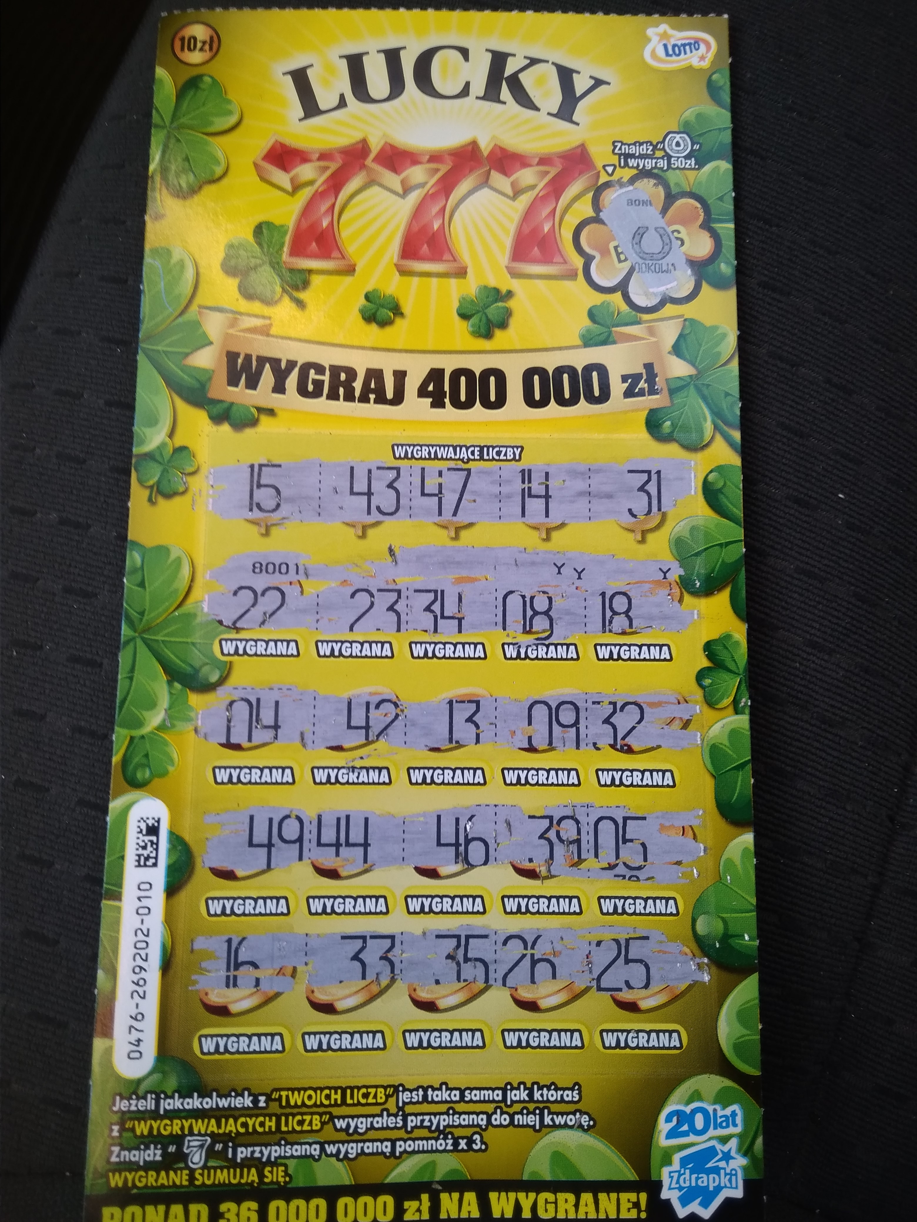 Jako ,że mało się dzieje to wstawiam statystykę dla kupionych Lucky 777. Od startu zdrapki wydrapałem: