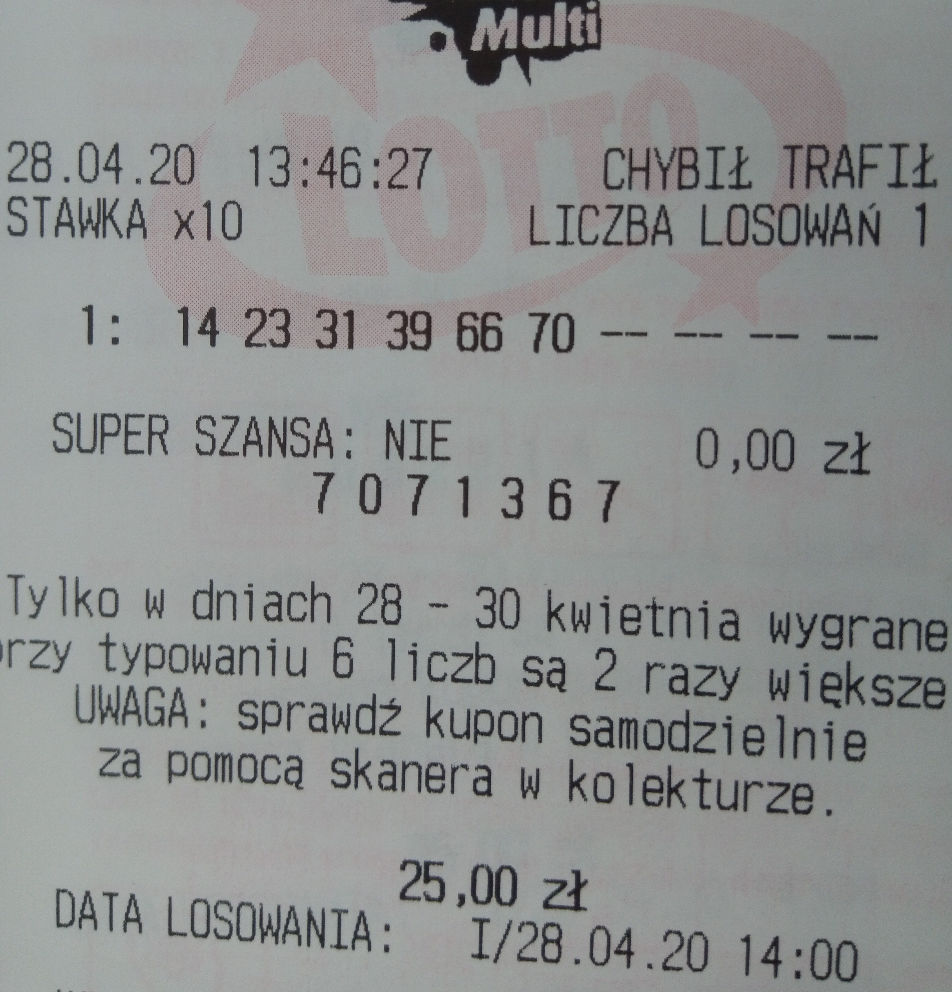 Nie gram w Multi ,ale jako że jest promocja puściłem zakład z plusem i bez na 5 promocyjnych losowań. I zwykły zakład już się zwrócił z nadwyżką wygrana 4/6.