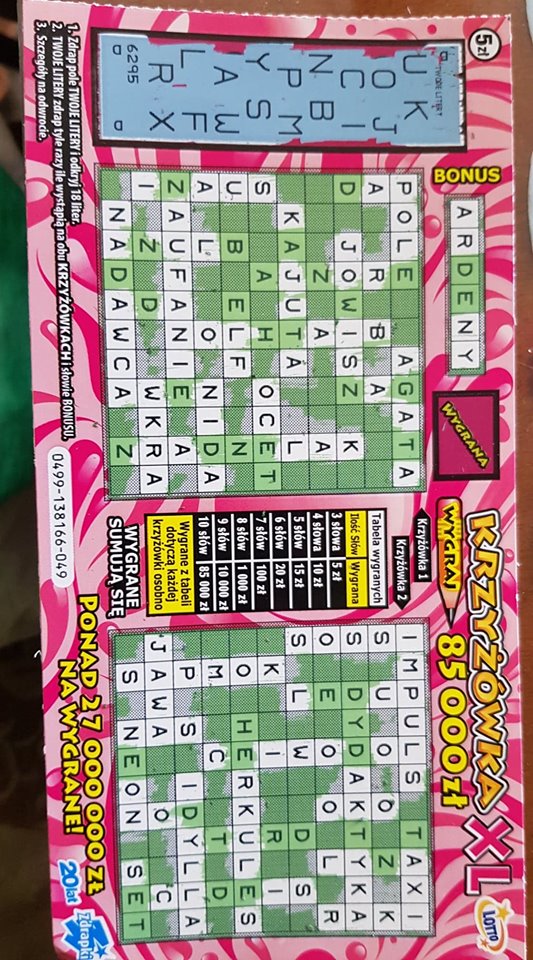 Szczęśliwa niedziela. Do mini wzięłam jedną krzyżówkę i wydrapałam 100 zł. Potem wzięłam 80 zł, a za resztę dwie linie i 2 krzyżówki po 5 zł. W krzyżówkach było 2x5 zł, a w linii 30 zł i jedna pusta.