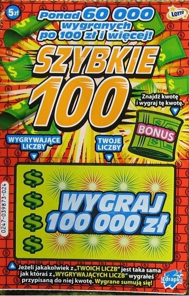 Kiedy ta zdrapka była w sprzedaży ja się jeszcze miarkowałem z zakupem losu za 5zł, ale gdybym wiedział, że tak łatwo jest te 100zł trafić to bym brał ją częściej. Jednakże na ok. 10 kupionych miałem 1x20zł w dniu premiery oraz 4-5 x 5zł. Na pewno więcej wygranych niż pustaków.