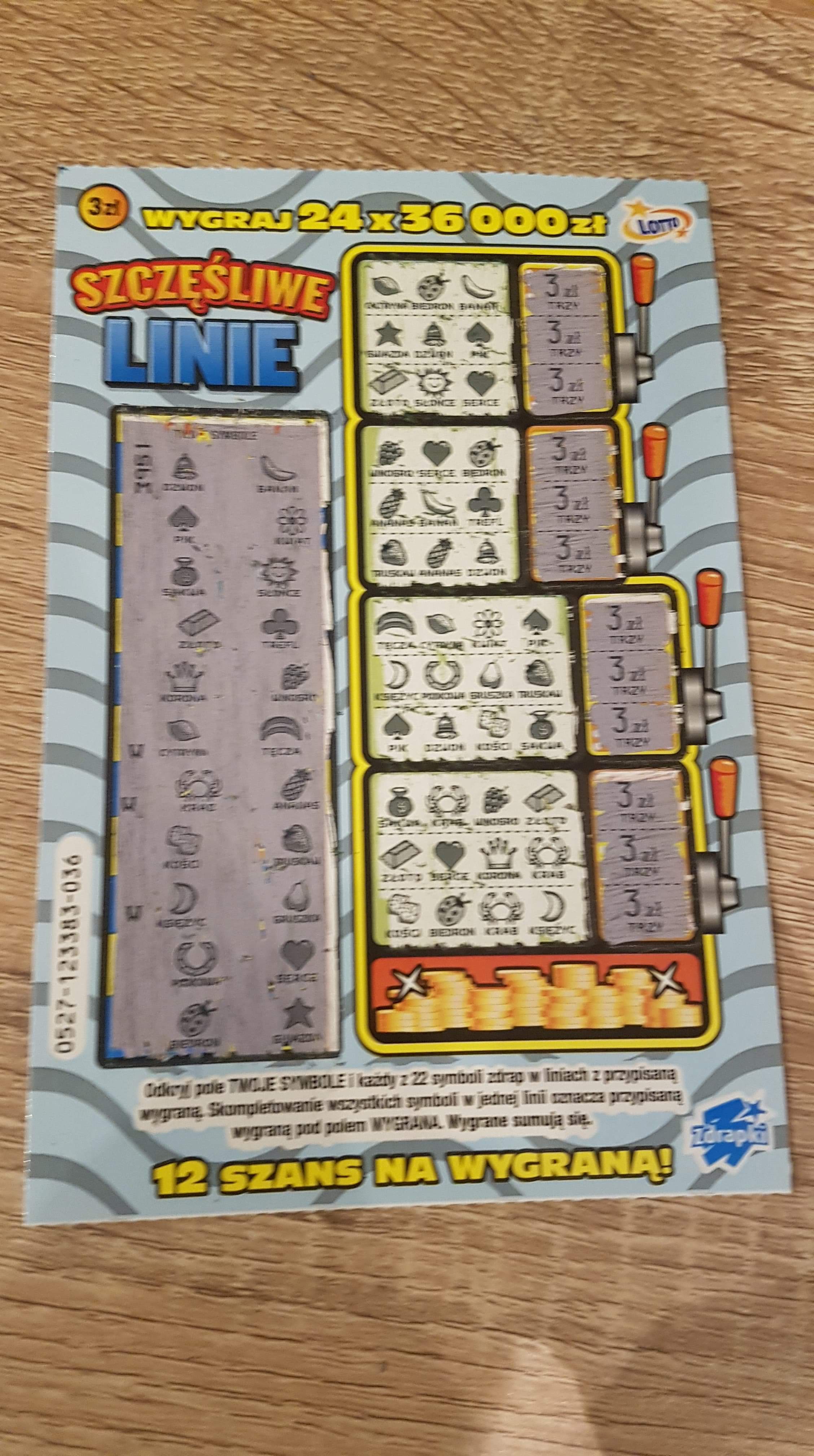 Mąż kupił mi dzisiaj jedną sztukę. Ma szczęśliwą rękę bo moja największa wygrana w tej zdrapce - 360 zł to też od niego. Dzisiaj 18 zł w numerze 74.