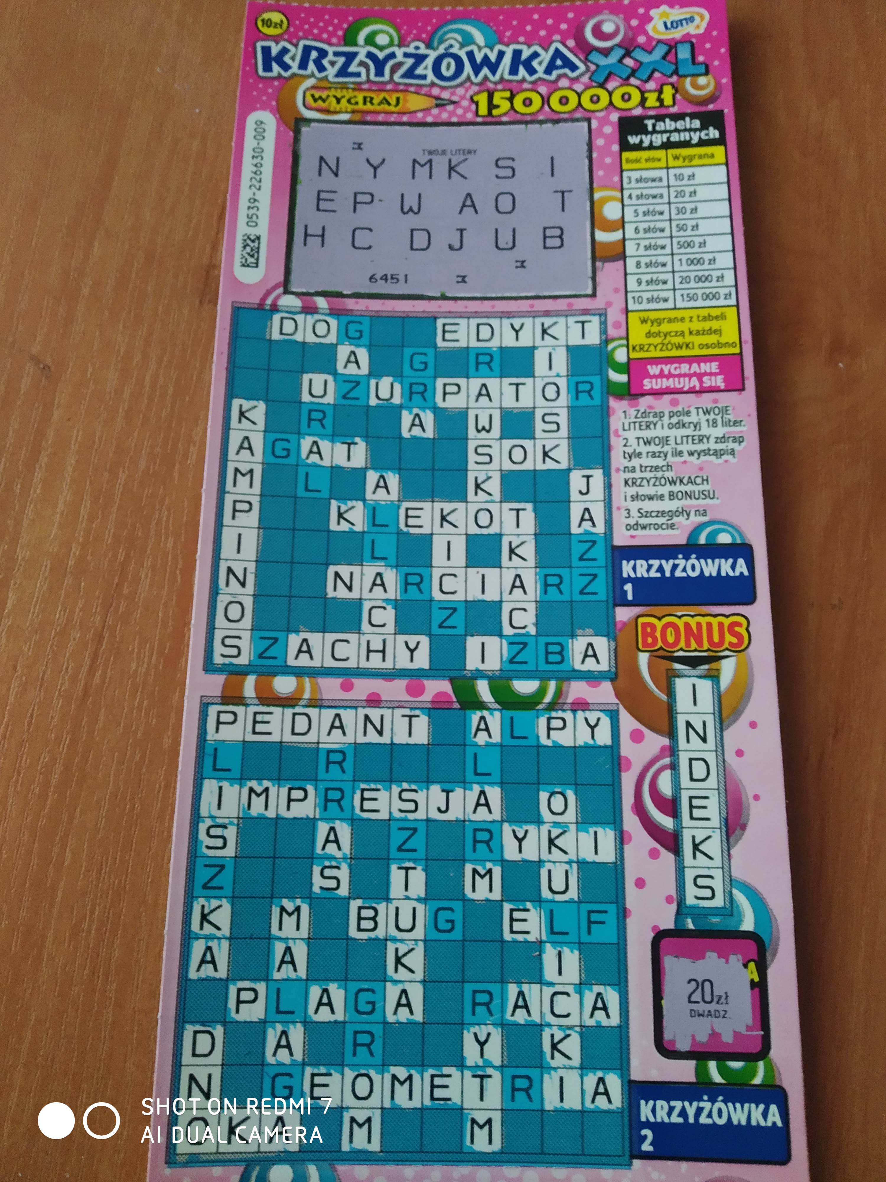 Wygrane w Różowym złocie 20 zł wymieniłam na linie i krzyżówkę po 10 zł. Linia nr 1 pusta, KrzyżówkaXXL nr 23 dała 30 zł. Ale sama się zdziwiłam bo pierwsze zdrapane literki to F,V,X.
