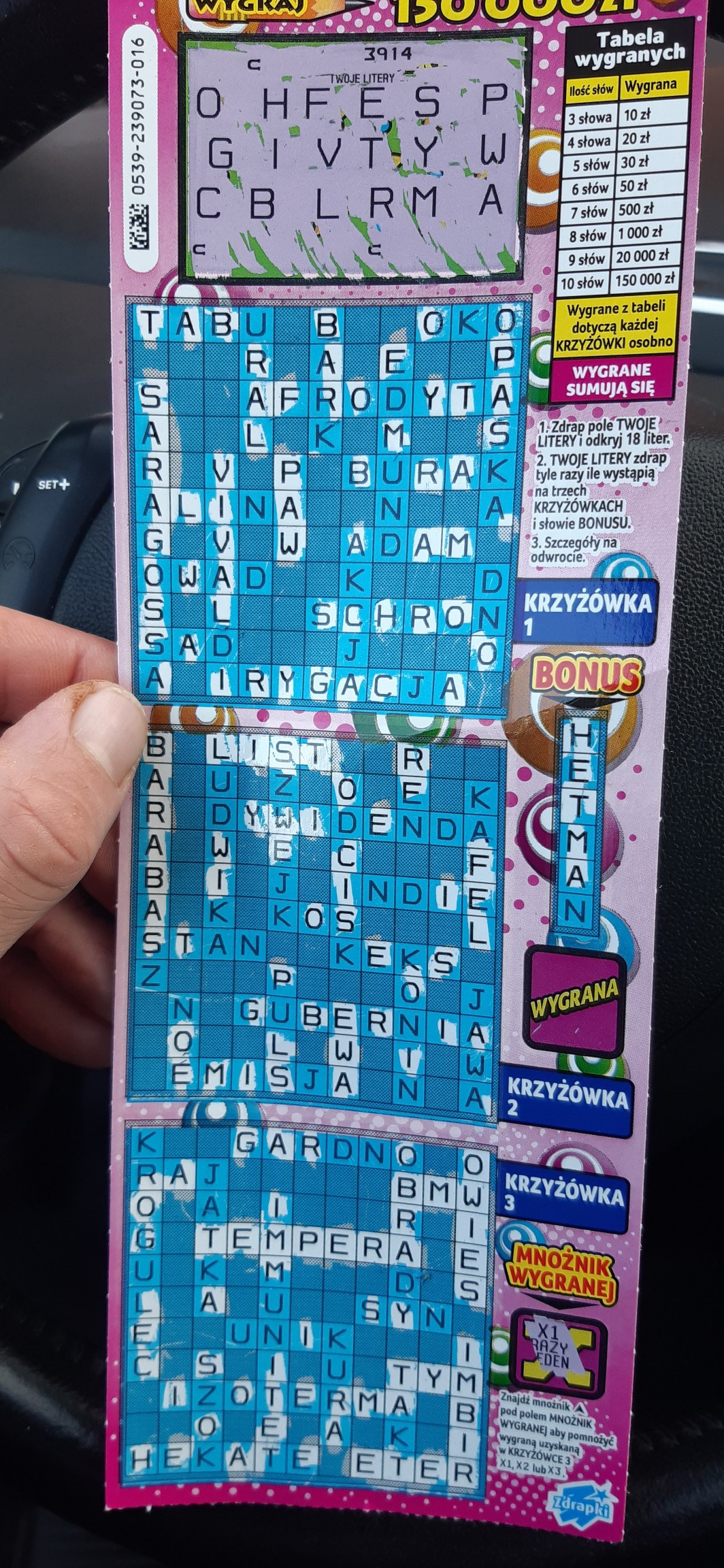 Wygrane w Różowym złocie 20 zł wymieniłam na linie i krzyżówkę po 10 zł. Linia nr 1 pusta, KrzyżówkaXXL nr 23 dała 30 zł. Ale sama się zdziwiłam bo pierwsze zdrapane literki to F,V,X.