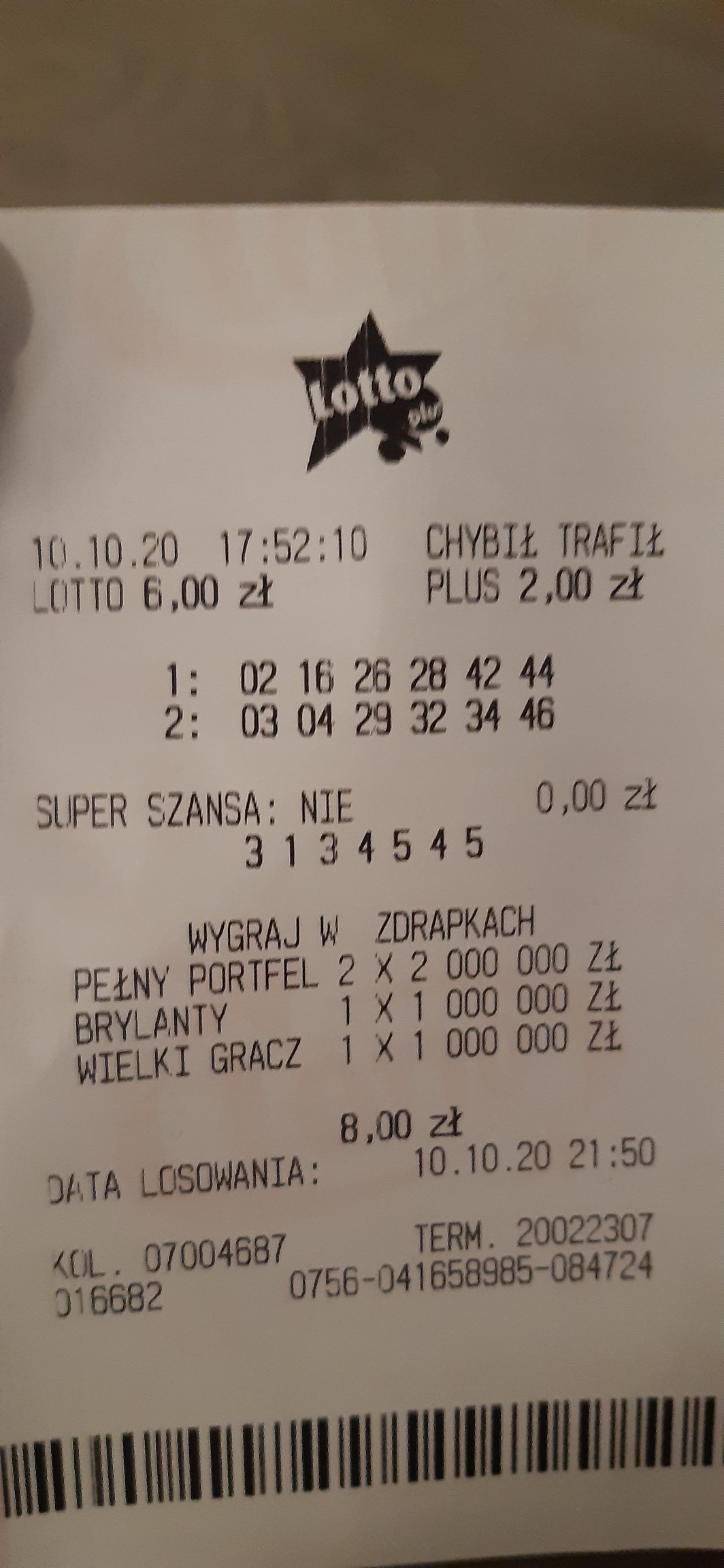 Kolejne 2/6, zarówno w lotto jak i w plusie. W sobotę znów puszczę zakład, do trzech razy sztuka :)