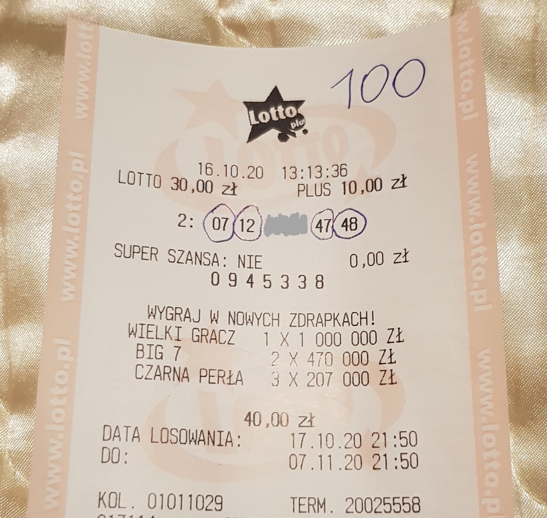 Wpadła czwórka w lotto plus 100 zł, trafione dwie pierwsze i dwie ostatnie, liczby jeszcze w grze kupon wysłany w Warszawie.