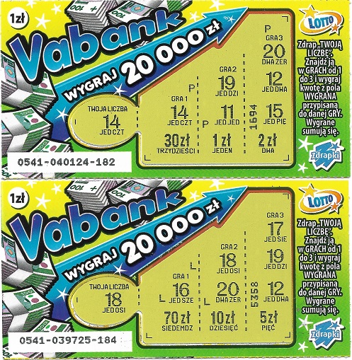 Vabank trzyma poziom. Dzisiaj do południa w jednym punkcie wziąłem 2szt i wpadło 1x30zł. Wieczorem wymieniłem w innym punkcie, znowu wziąłem 2 sztuki i wpadło 1x10zł.
