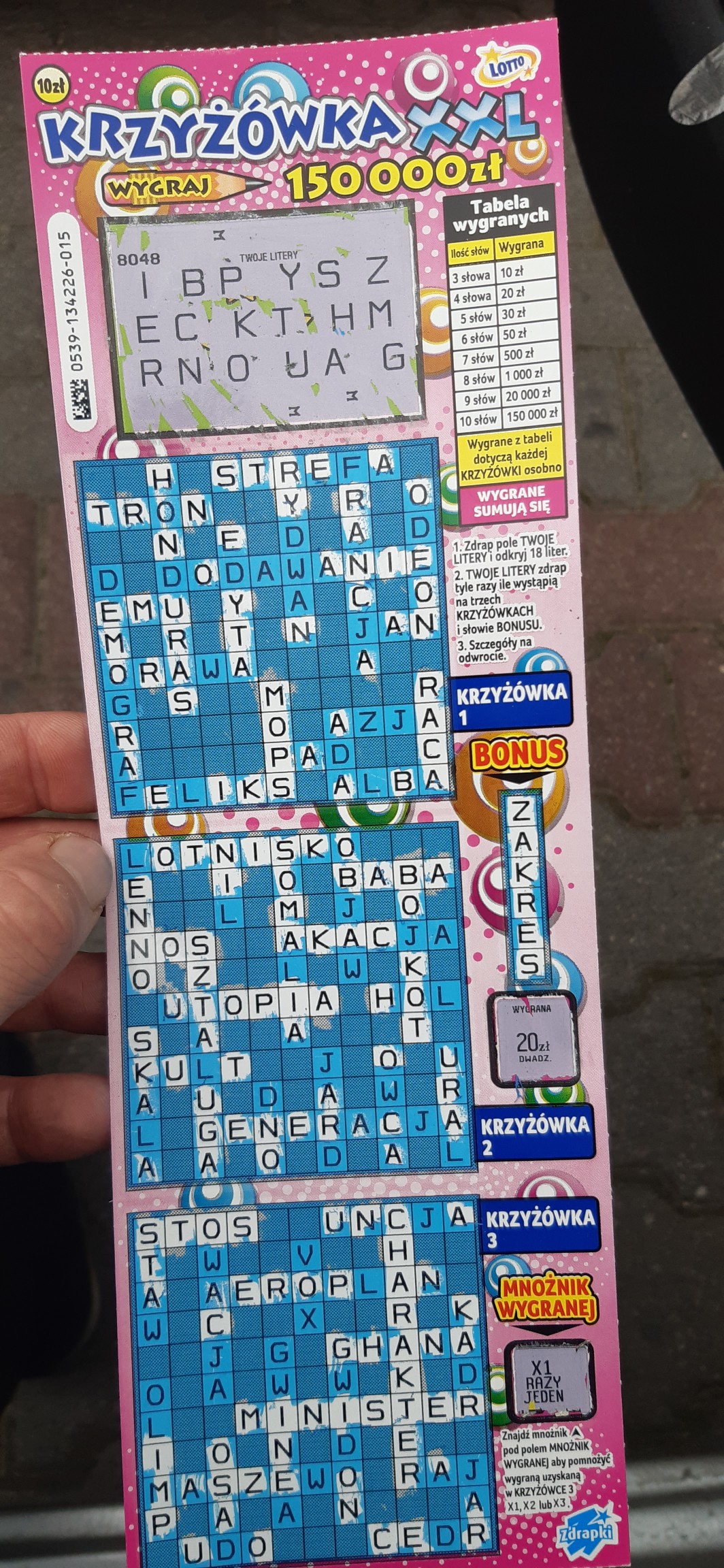 Jak dotąd moja najwyższa wygrana w krzyżówce. Wydrapane 6 wyrazów x2 czyli 100 zł.