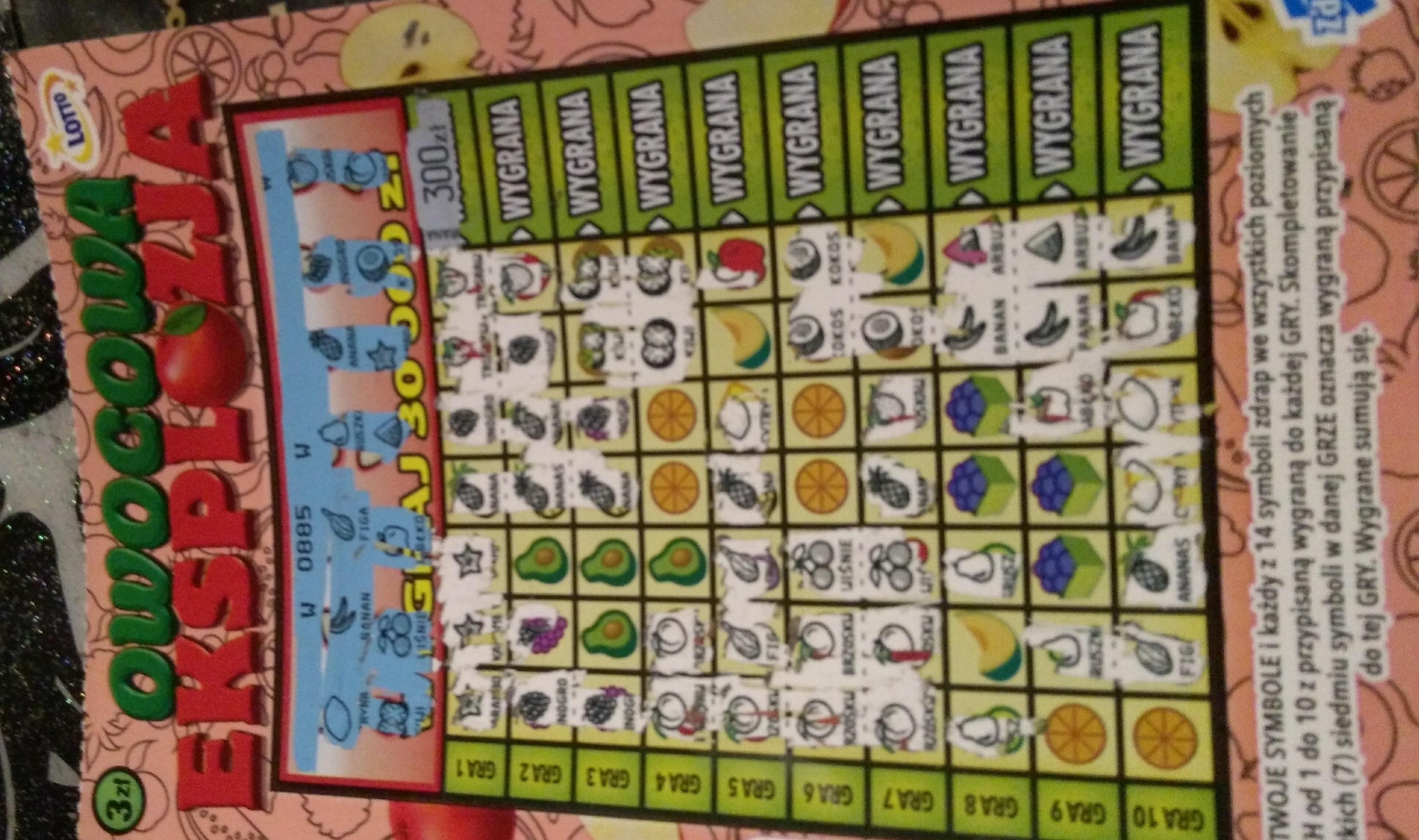 w owocowej nigdy nie uda się zdrapać wszystkich linii. Na planszy mamy 18 rodzajów owoców, a na polu Twoje Symbole jest 14 rodzajów. Zawsze na końcu zostają 4 grupy owoców niezdrapane, np. u Natalki zostały: melon, adwokato, pomarańcza i borówka afrykańska :)
