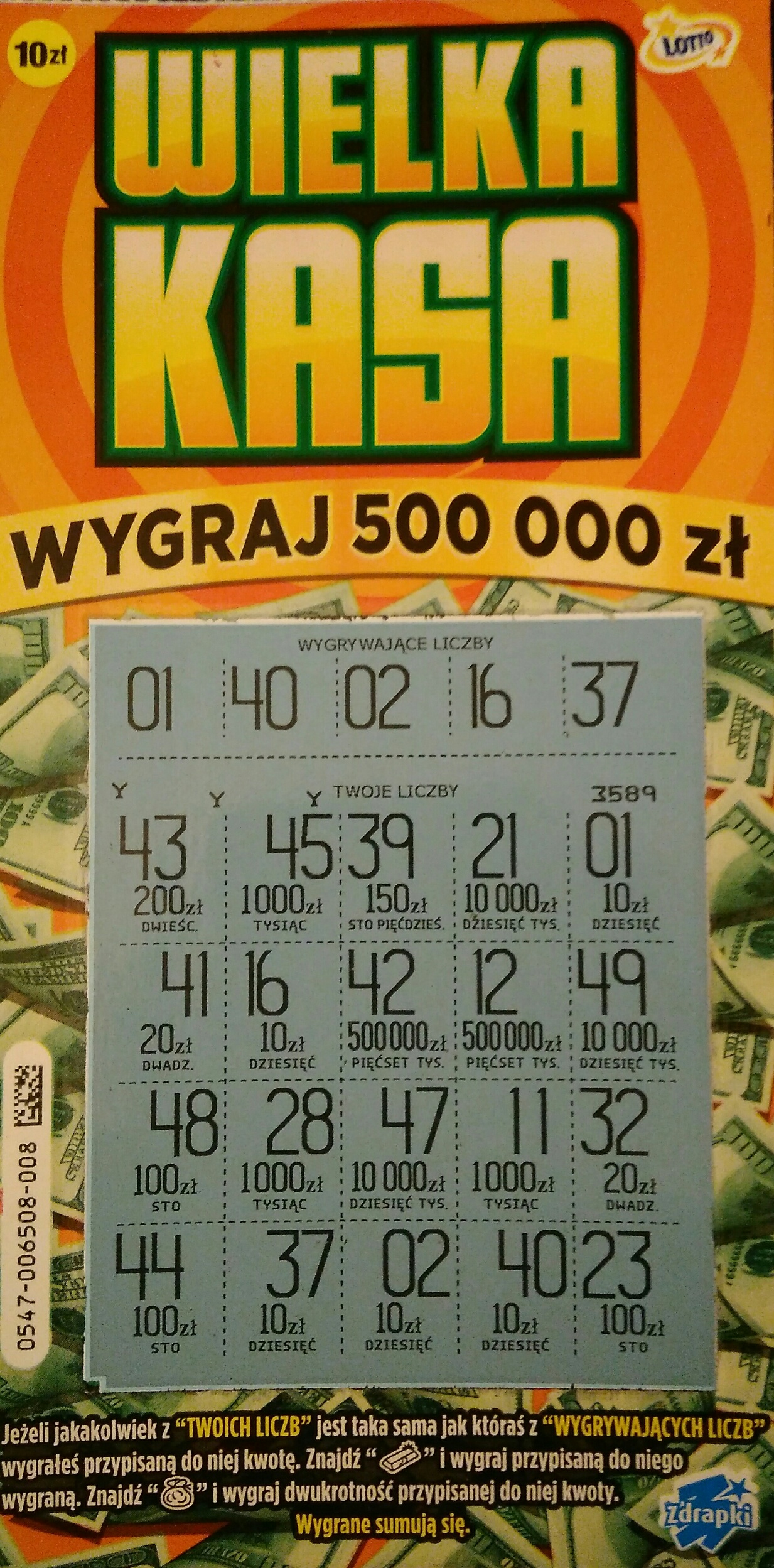Wczoraj symbol worka i 20 zł w nr 016 ze zdrapkomatu
