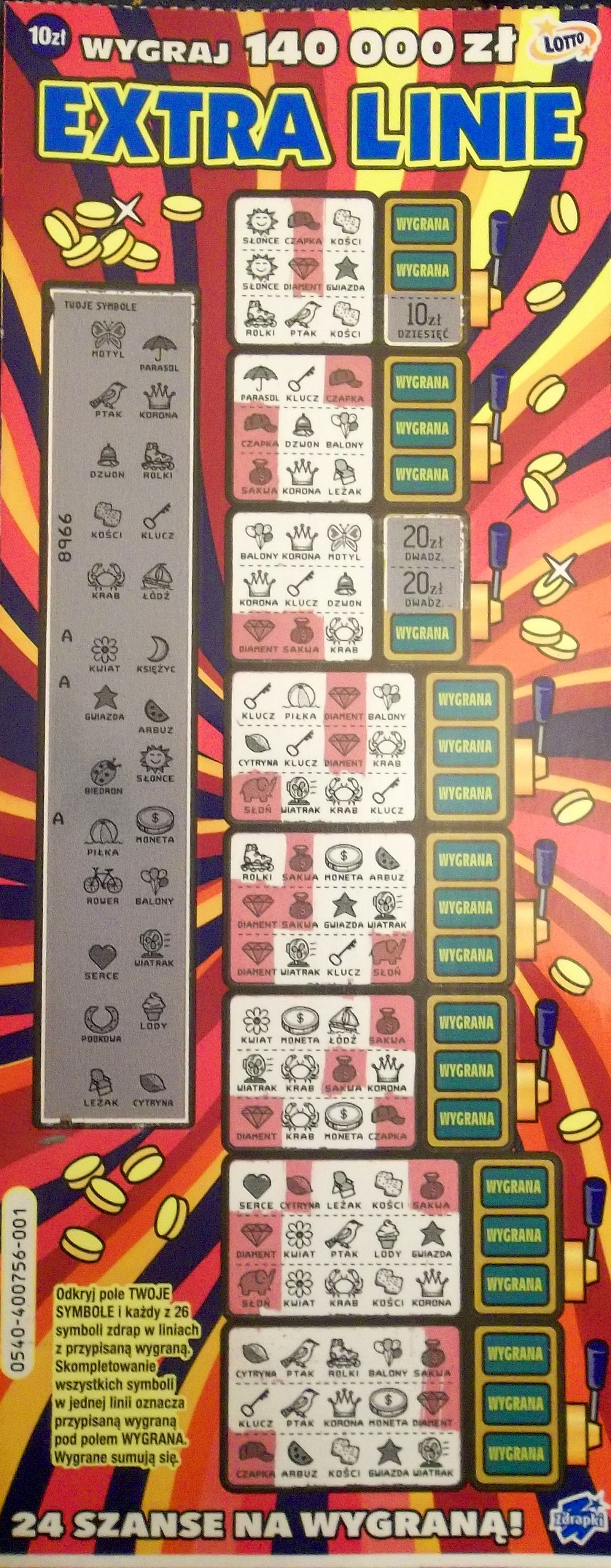 Chcąc nie chcąc extra linie są chyba najsłabszą zdrapką za 10zł. Bardzo mało nagród od 100 wzwyż. Z wykreslanek to wybrałbym już szybciej krzyżówkę xxl ale i ona daje wiele do życzenia. Moim zdaniem najlepsze zdrapki za 10 to 500 w banku i mega pensja, a reszta to marne podróbki z przeoranymi tabelkami.
