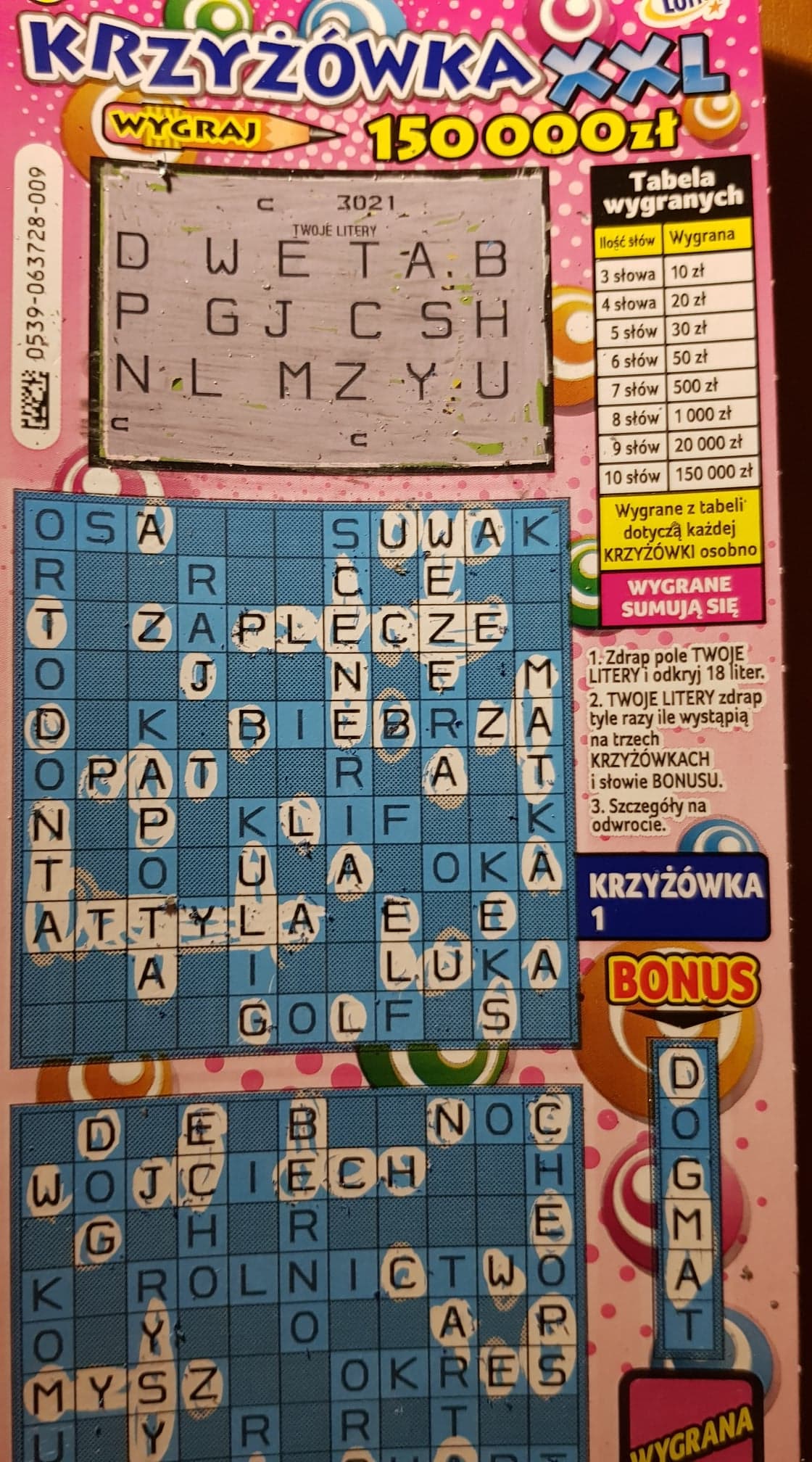 Z tej samej paczki wzięłam dwie sztuki: pustak w nr 022 i 40 zł w nr 021 (w każdej krzyżówce po trzy słowa plus bonus ze słowem OBSZAR)