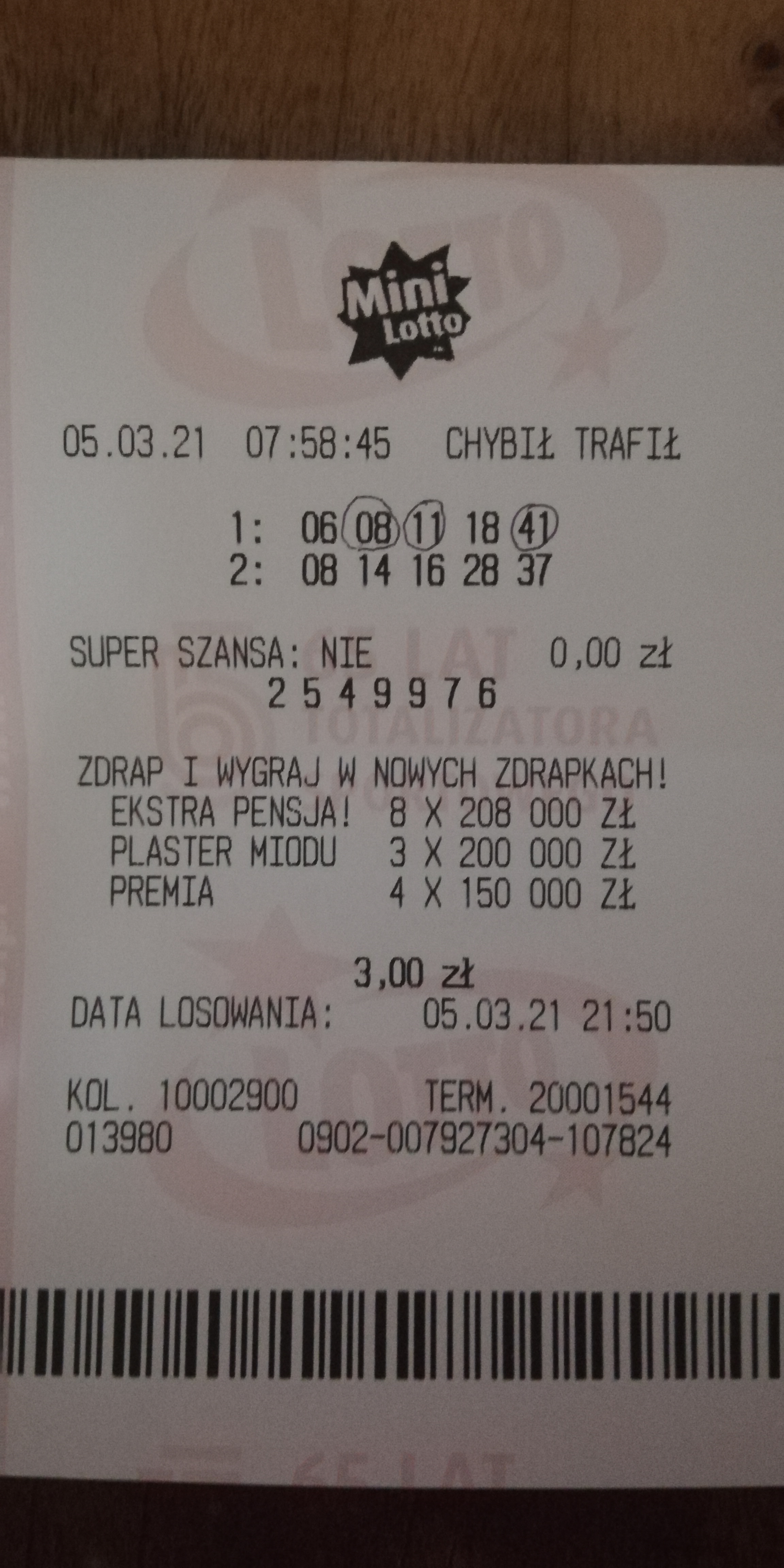Dziwne ponad milion zakładów i nie ma piątki, dla mnie ta gra już działa mocno na nerwy. 4 miesiące gry 4-6 zakładów dziennie i zlamanej trójki nawet nie ma.