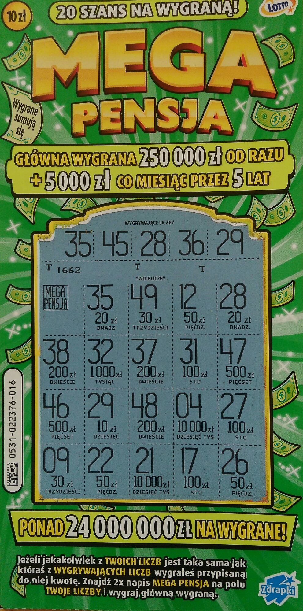 Ogólnie wzięte trzy sztuki zdrapek po dyszce i 30 zł zamienione na 90