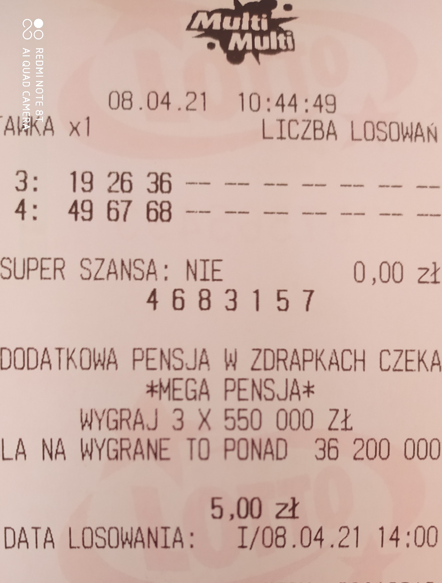 W wieczornym losowaniu - "Gratulacje! Trafione 4 z 5", bez plusa, co chyba daje 20 złotych
