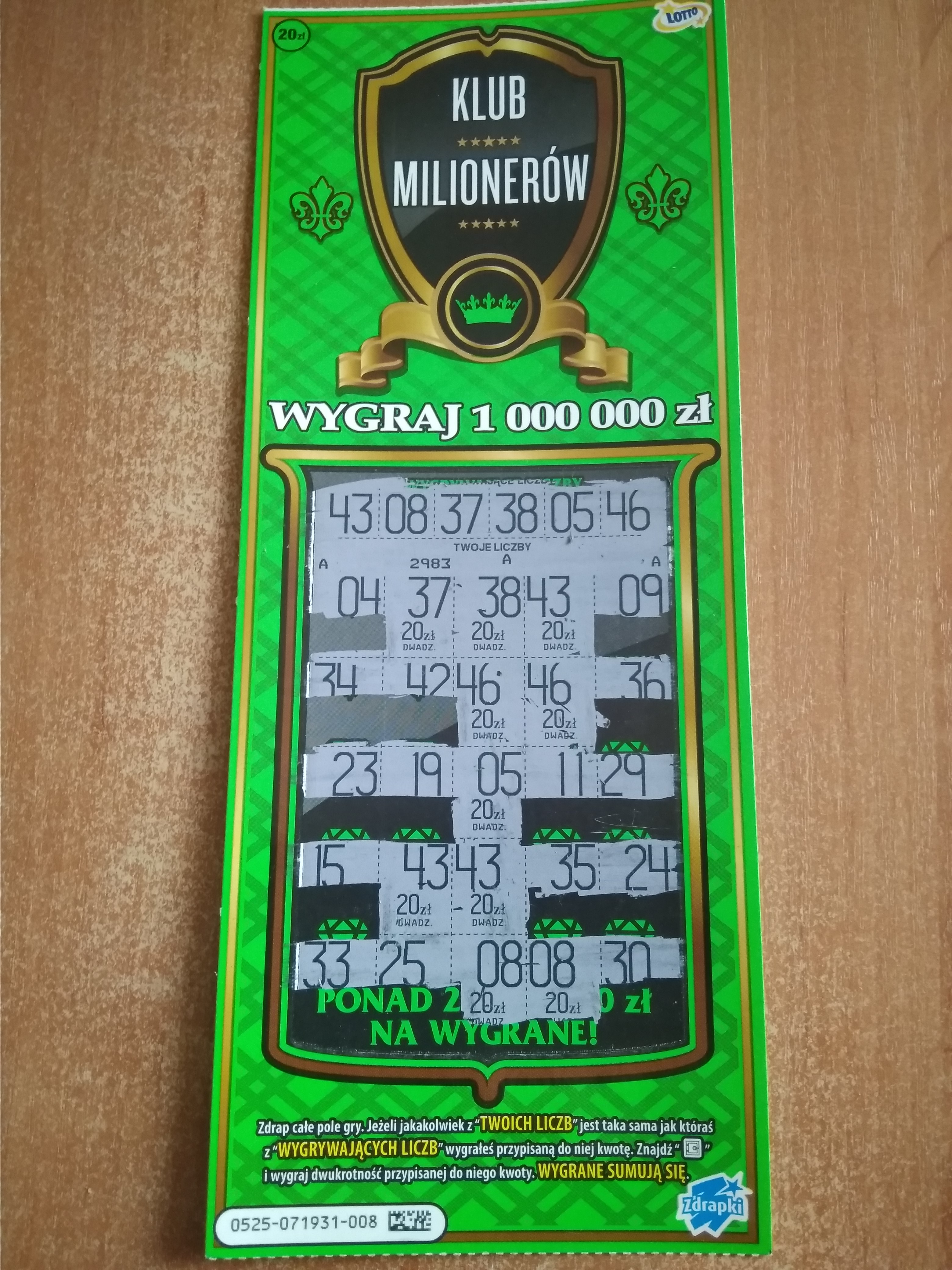 Zdrapek za 20zł już praktycznie wcale nie kupuję, nawet na premierze ale że klub milionerów ma jeszcze MLN do wydrapania i mało losów to sobie pomyślałem że jedną kupię. Wydrapałem całe 100zł i to jest moja najwyższa wygrana jesli chodzi o zdrapki za 20zł zatem pochwalę się fotką