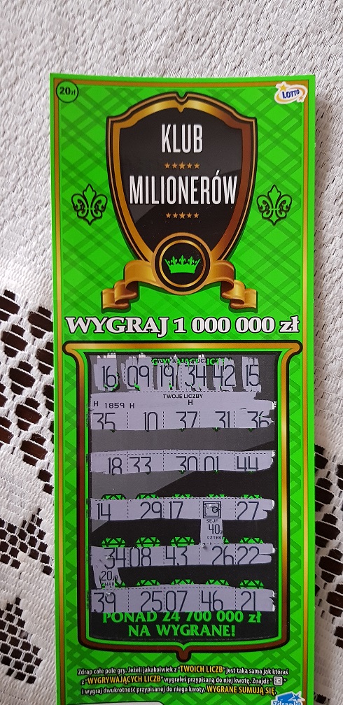 Wziął również chyba z 5 sztuk Klubu Milionerów, wiec postanowiłem też kupić 1 sztuke i zdrapać od razu, ale soię gość wkurzył jak wydrapałem przy nim 100 pln