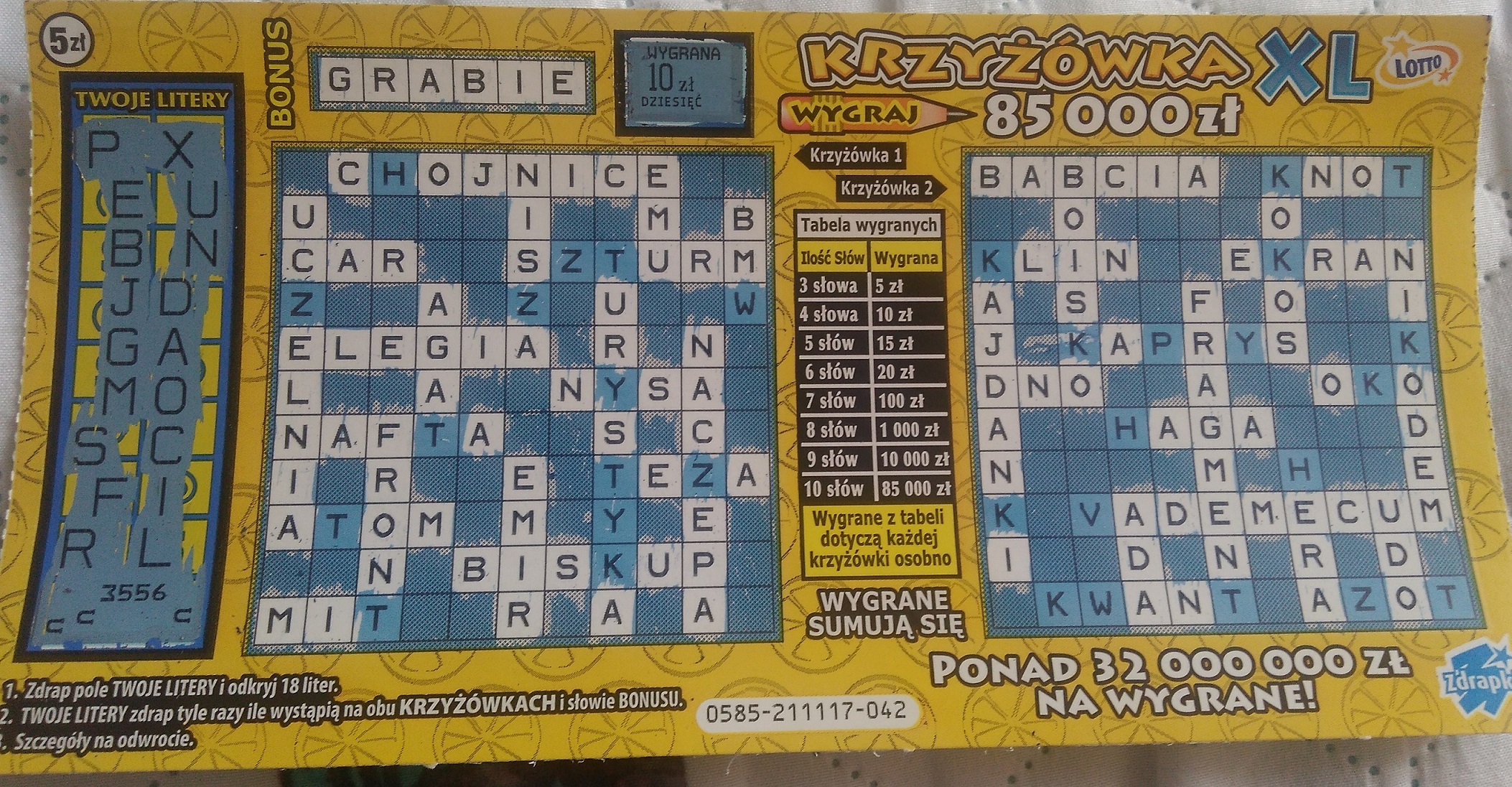 Mi trzy razy trafiła sie krzyżówka z słowem bonusowym LAMENT i za każdym razem była to pusta zdrapka, czwarty raz, jak będę widzieć takie słowo w bonusie już się na nią nie skuszę. Miał ktoś coś podobnego, że jak trafiło się dane słowo w bonusie, to był pustak?
