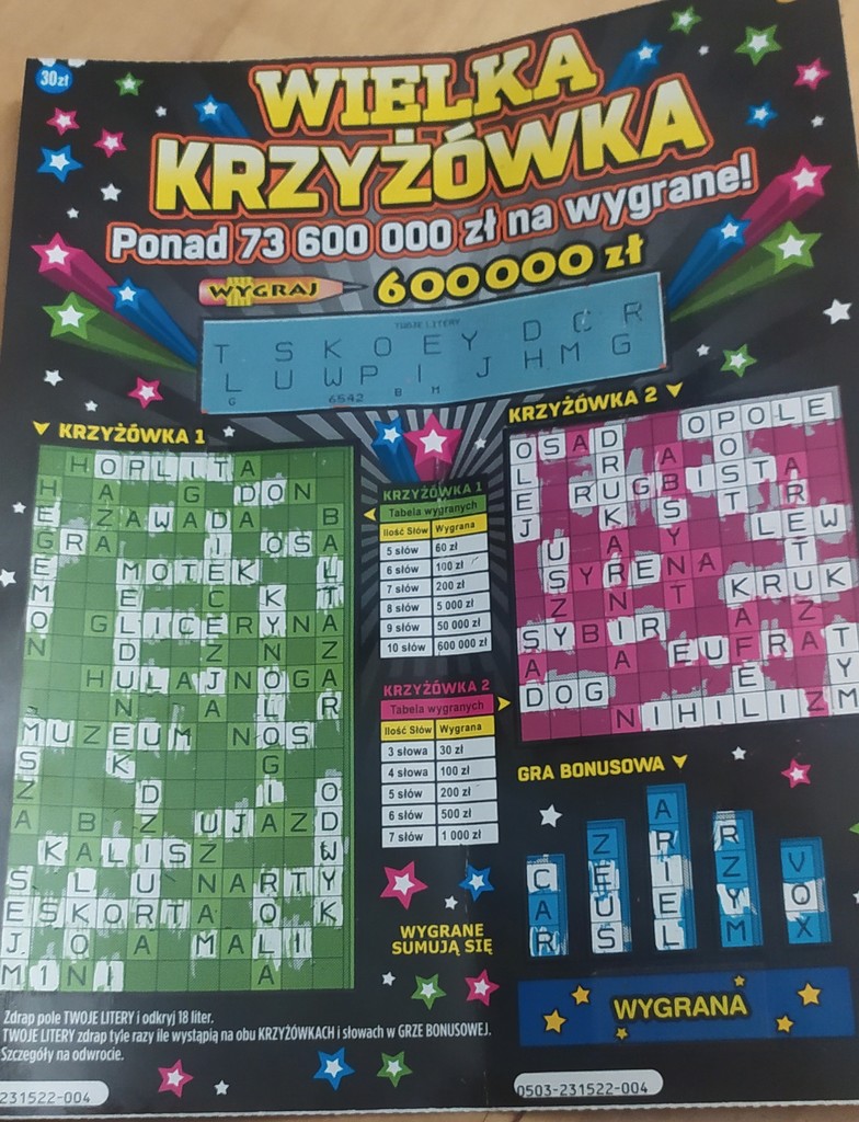 Wczoraj kupiłem jedną sztukę w kolekturze, nr 9 60zl, wymieniłem w punkcie z prasą na dwie. 1 pusta, a tutaj wpadło 500 rozbite na 2 krzyżówki i Bonus:)