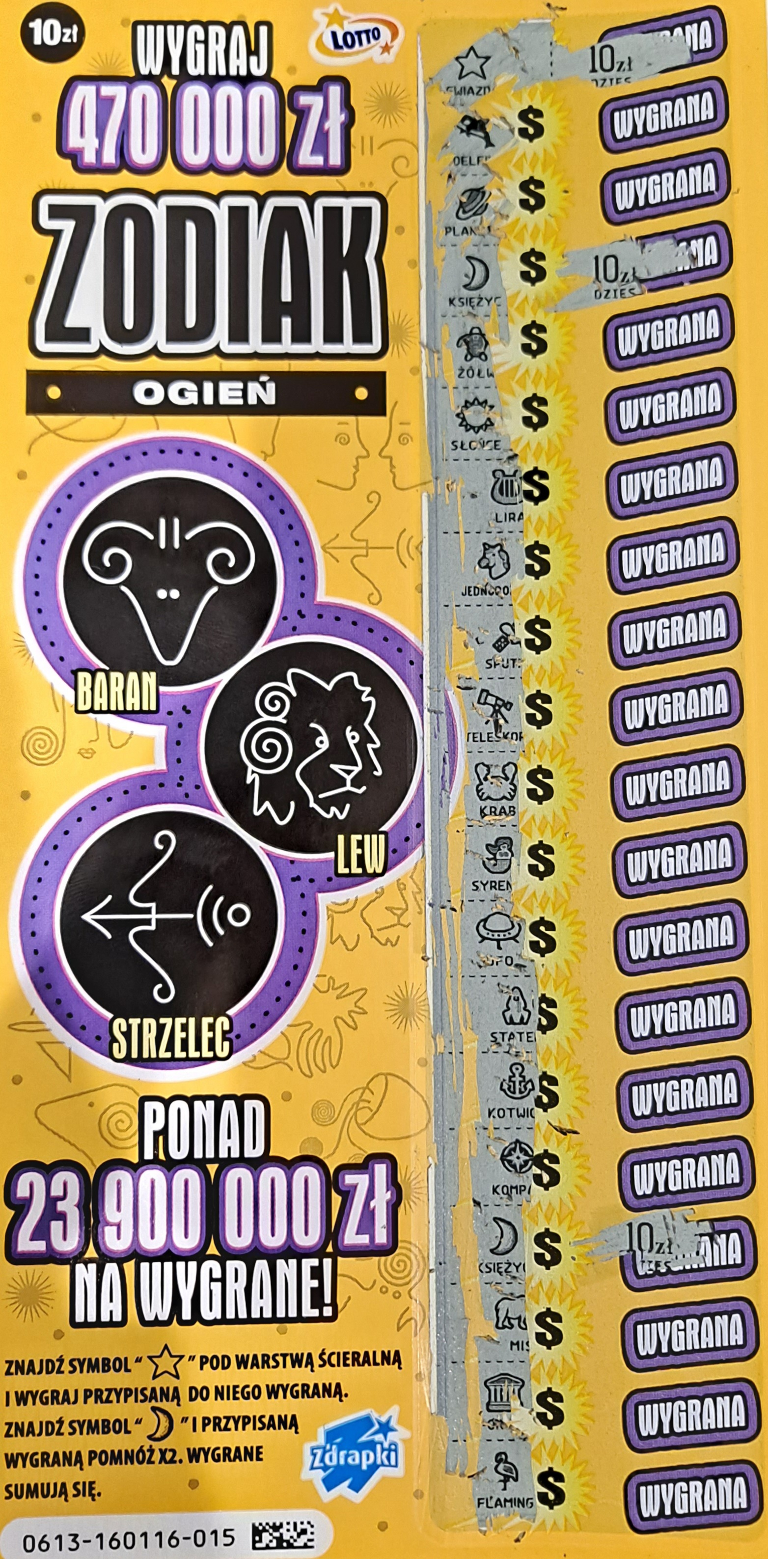P.S. Nie wszystkie symbole pasują tematycznie do Zodiaka ale są w sumie śmieszne. Nie przekreślam tej zdrapki ale nie budzi ona takich emocji jak stary Zodiak po 2zł, szczególnie że nie można wybrać swojego znaku. jak w większości zdrapek z kilkoma kolorami w paczce przeważnie 1 jest bardziej szczęśliwy od pozostałych, po pierwszych wpisać na forum widać że warto celować w ogień i taki też wezmę przy wymianie wygranej
