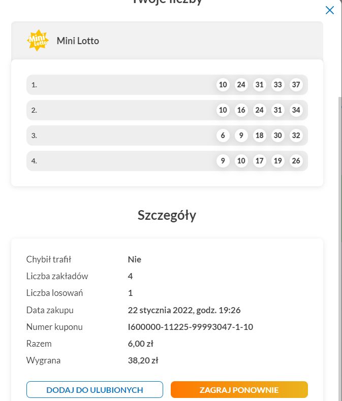 Mnie się niecały rok temu przyśniły liczby w mini, dwa zestawy różniące się jedną liczba. Gram od tamtego czasu tymi zestawami codziennie. Miałem trójkę 3 lub 4 razy, dwójek nie liczę. Ale zestaw jest dość paskudny, cztery liczby z pierwszej dziesiątki plus 20 lub 40