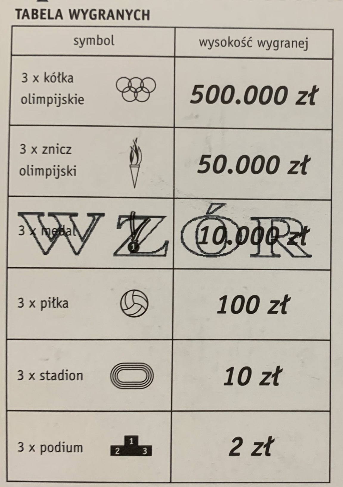Tabela wygranych: