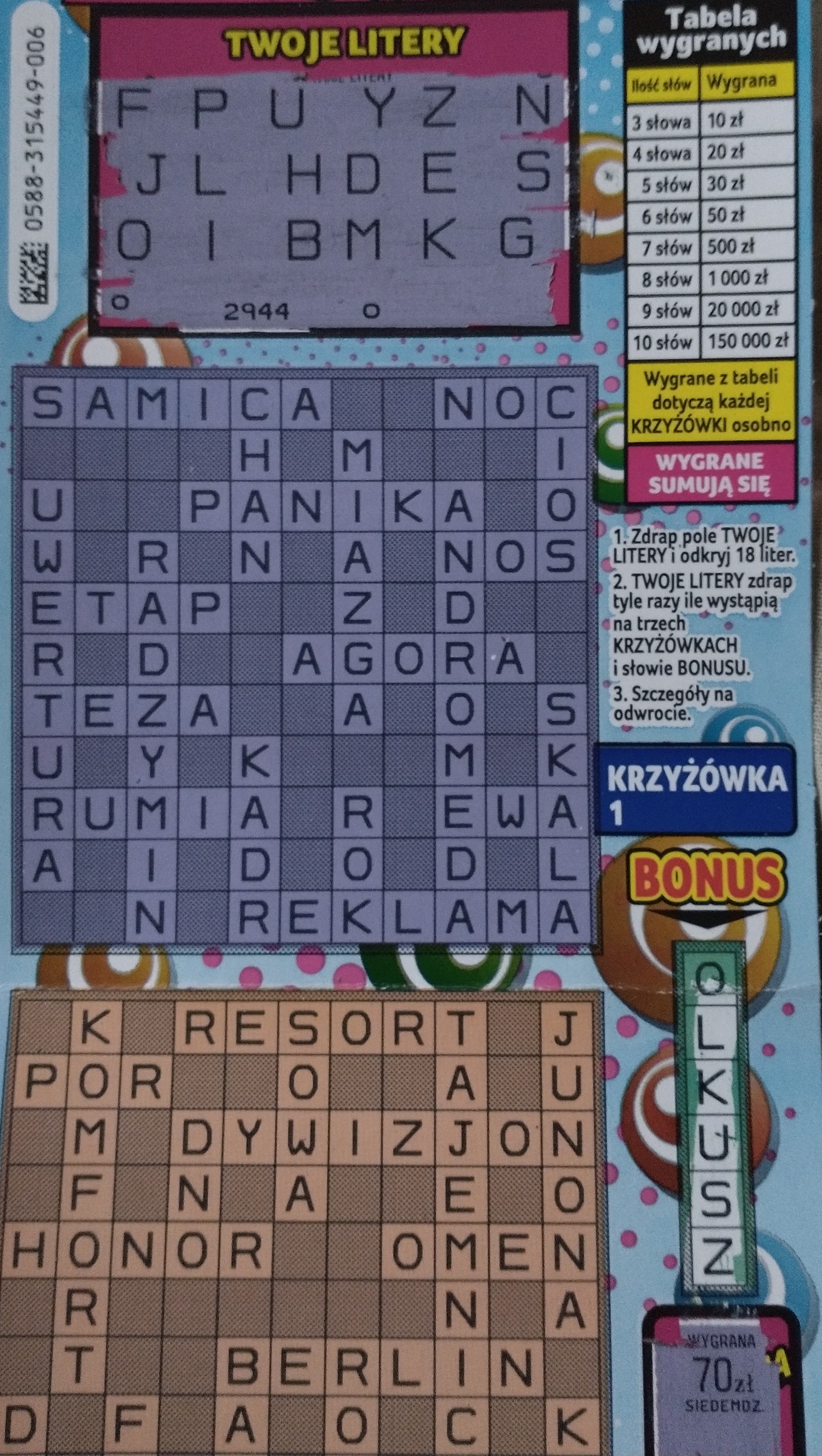 Witam! Z dwóch kupionych krzyżówek 016 pusta, a 004 szczęśliwa.